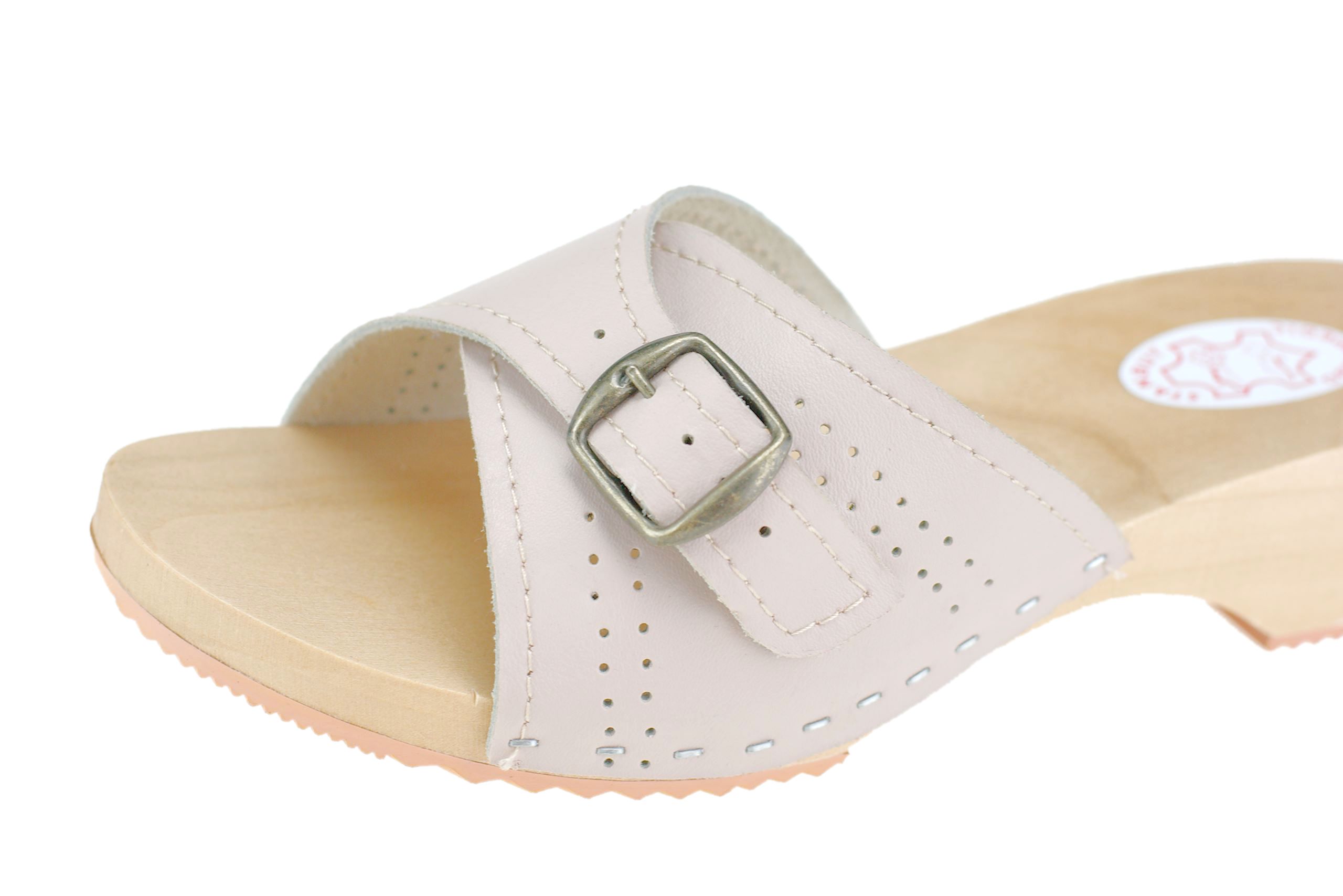 Регульовані жіночі дерев'яні шльопанці доступні в кількох кольорах. У цій моделі використовується ремінець шириною 20 мм і біла або натуральна пряжка в залежності від кольору шкіри. Регулювання дозволяє вільно прилягати взуття до вашої ноги. Шкіра має перфорацію, що забезпечує хорошу вентиляцію, а також комфорт і практичність використання.