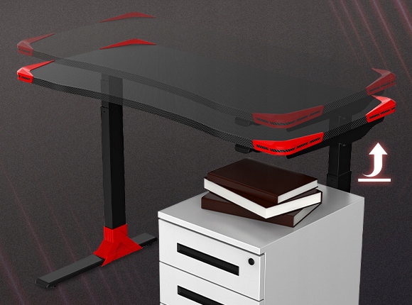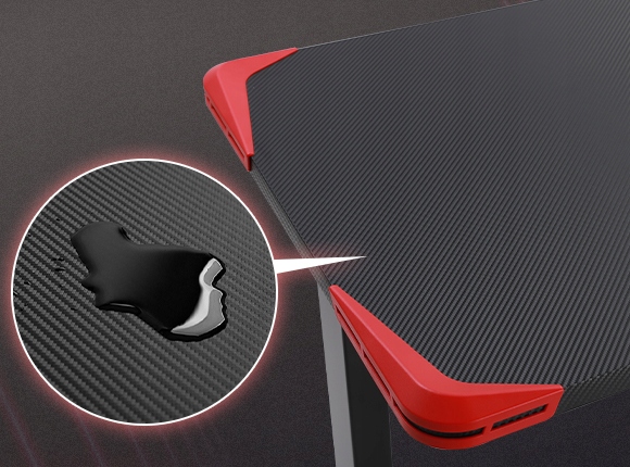 Стіл оснащений стільницею, поверхня якої покрита спеціальним покриттям, що імітує текстуру вуглецевого волокна. Стільниця розміром 1200 мм x 600 мм вміщає понад середню кількість ігрового обладнання та обладнання. Відповідні розміри конструкції та стільниці забезпечують високий рівень ергономіки, завдяки чому ви збережете свої рефлекси під час гри. Кнопки вгору/вниз дозволяють легко регулювати ідеальну висоту стільниці. Налаштування надзвичайно інтуїтивно зрозуміле.