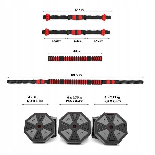 Набір включає дві планки, чотири затискачі, що з’єднують дві планки, і загалом 12 вагових пластин (2,75 кг x 8 шт., 2 кг x 4 шт.).