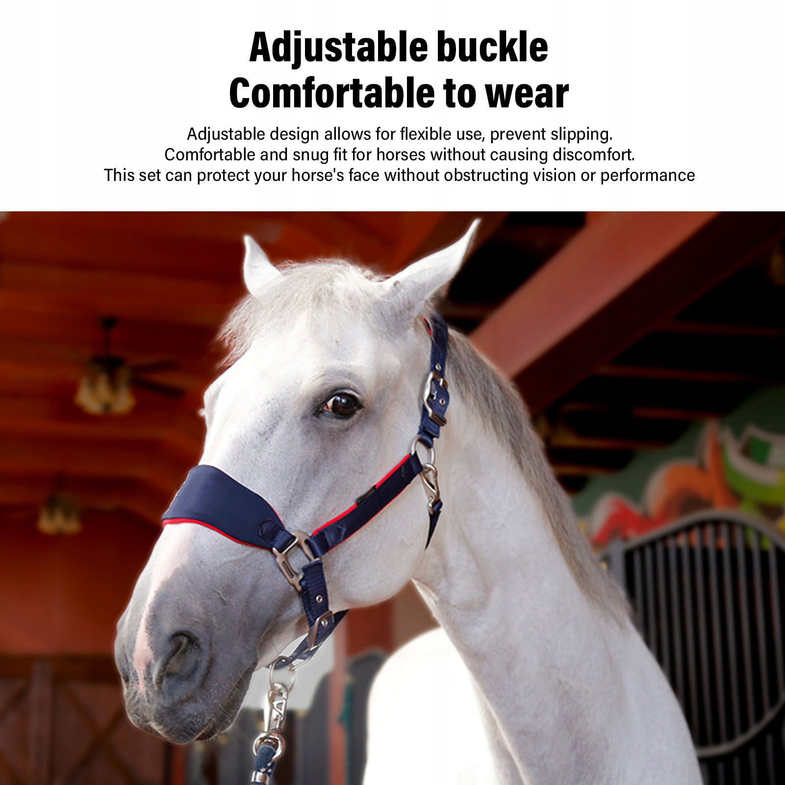 3. Налаштування для коня: цей регульований недоуздок можна легко відрегулювати відповідно до коней різного розміру та форми голови, забезпечуючи гнучкість і щільне прилягання до будь-якого коня.