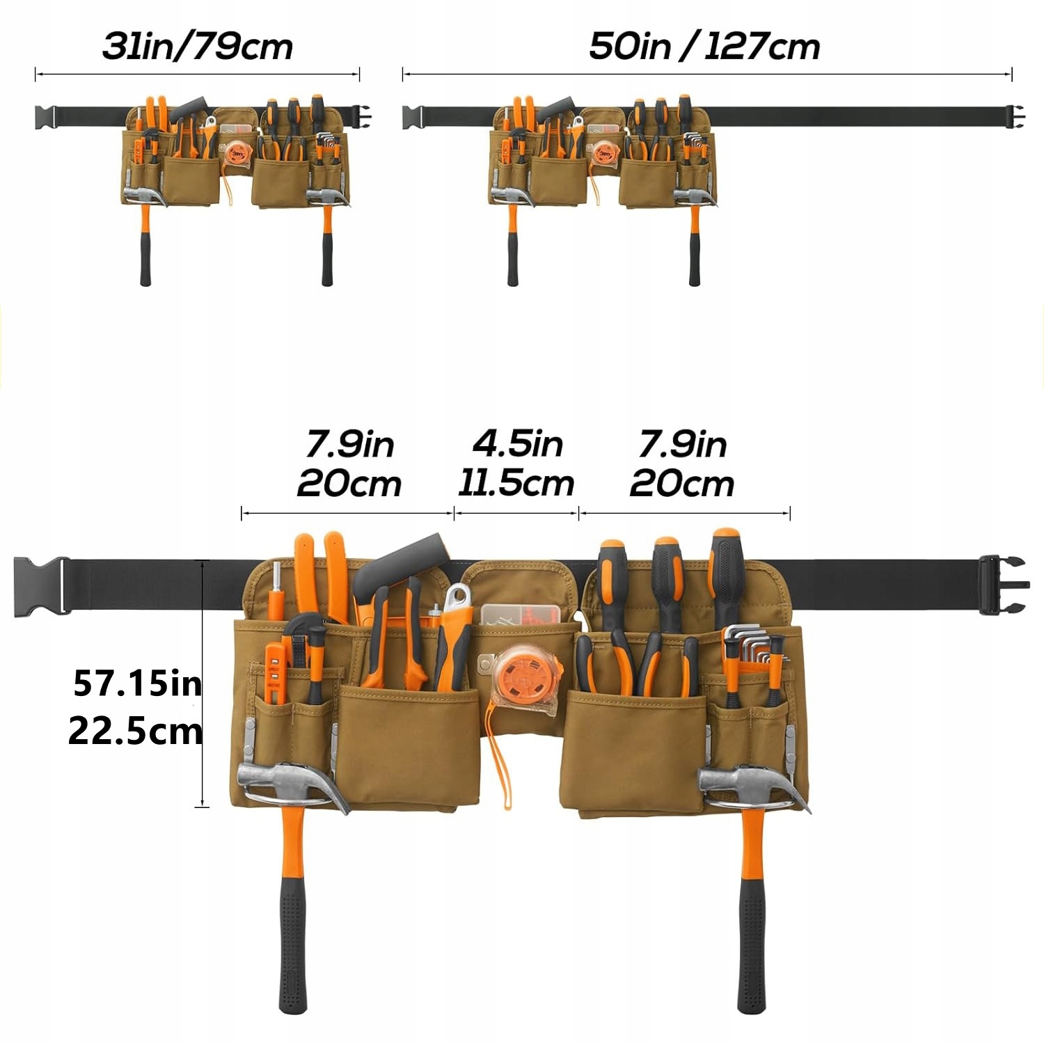 19 кишень: На барі є 19 кишень, як великі, так і маленькі. Це означає, що ви можете носити багато ручних інструментів на робочому місці, а також вимірювальну чашку та дві сталеві підвісні петлі. Довіряйте своїй тривалої сили, щоб протистояти найскладнішому завданням. Підходить для 79-127 см