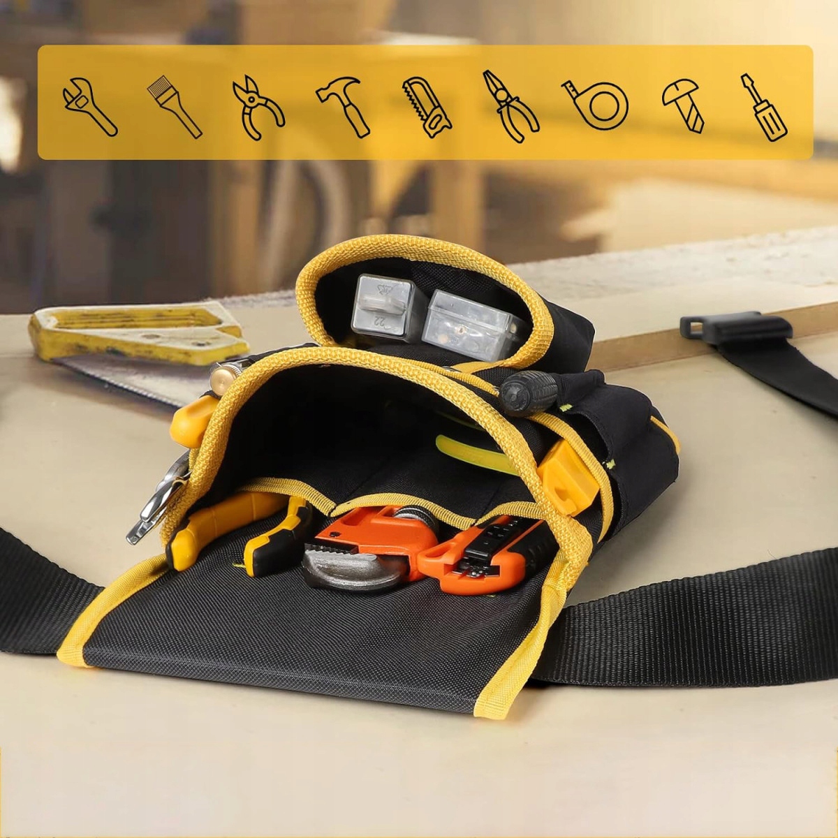 високоякісна сталева обертова кронштейна та зміцнення нитки зберігають молоток у вертикальному положенні під час згинання або на колінах. Глибокі кишені запобігають випаданням або ковзанням інструментів. Ідеально підходить для всіх робіт, таких як електрики, столяри, будівництво, садівництво, прибирання тощо.