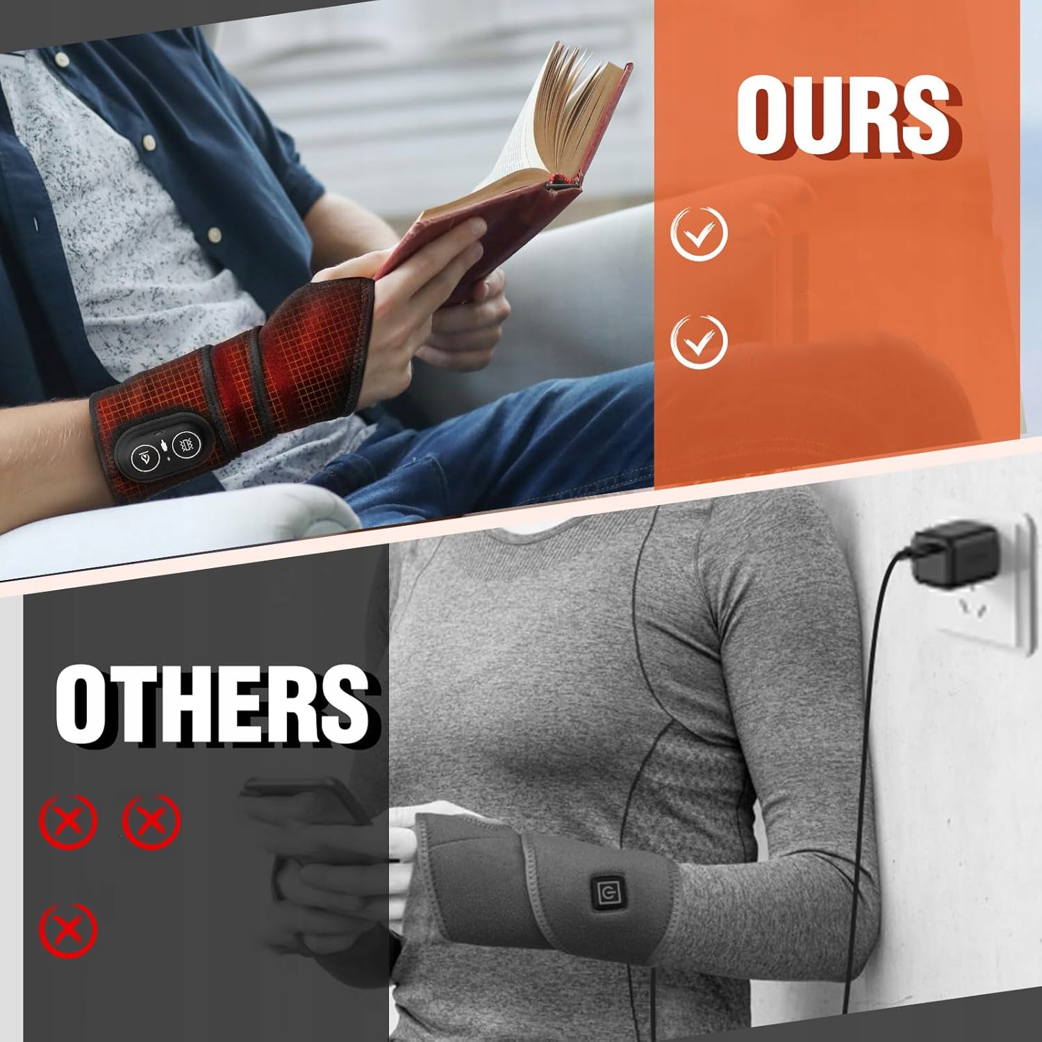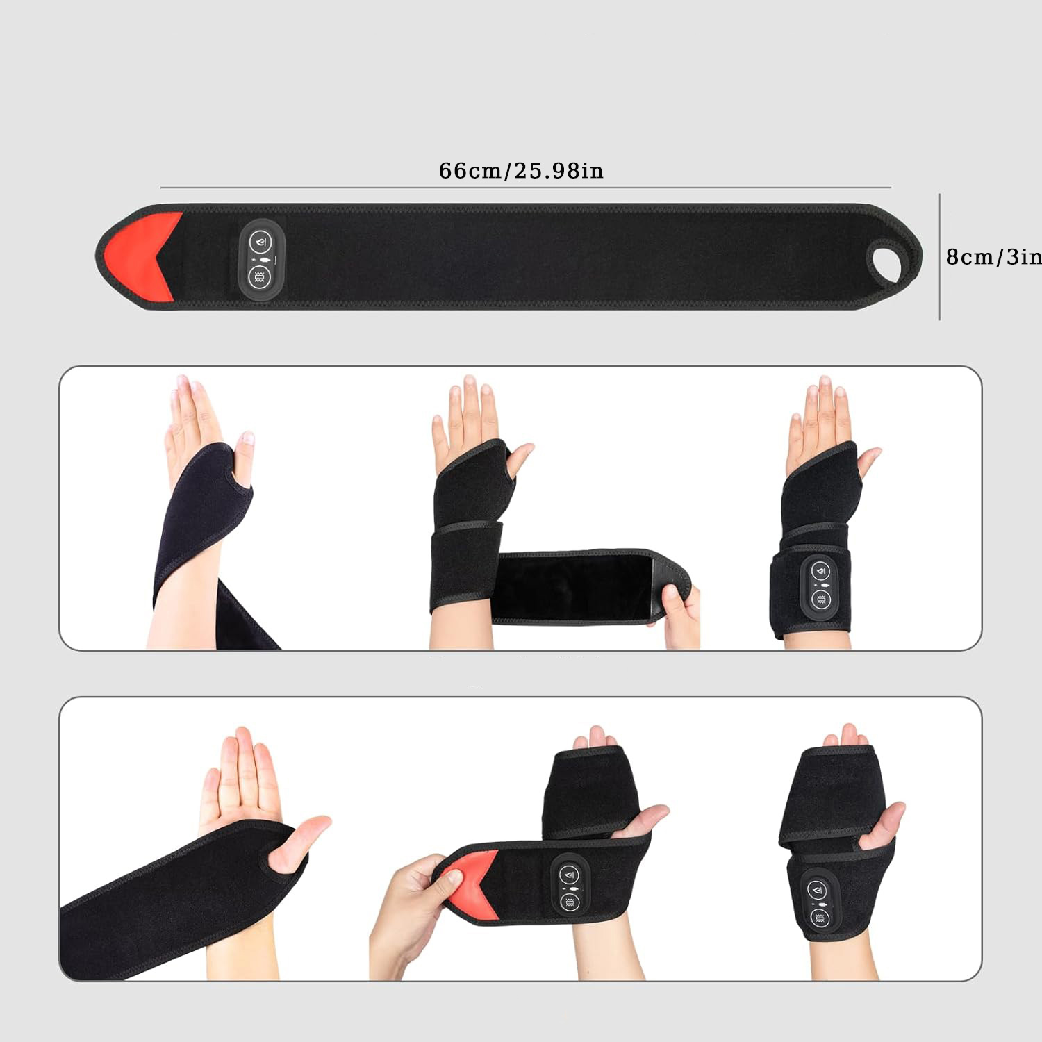 Ця знеболювальна пов’язка зап'ястя пропонує3 рівні нагріву (високий, середній, низький) і 3 налаштування масажу (висока, середня, низька). Легко регулюйте температуру і тривалість дії для отримання оптимального полегшення після роботи, ігор інструменти чи теніс.
