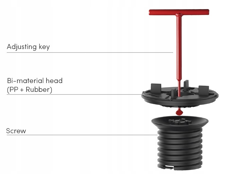 Ключ -м’яки, регульовані під терасовими пластинами tvsbpa2 , є чудовим рішенням, забезпечують точне регулювання (спеціальний ключ ) та отримання точного рівня поверхні без необхідності демонтажу дисків.