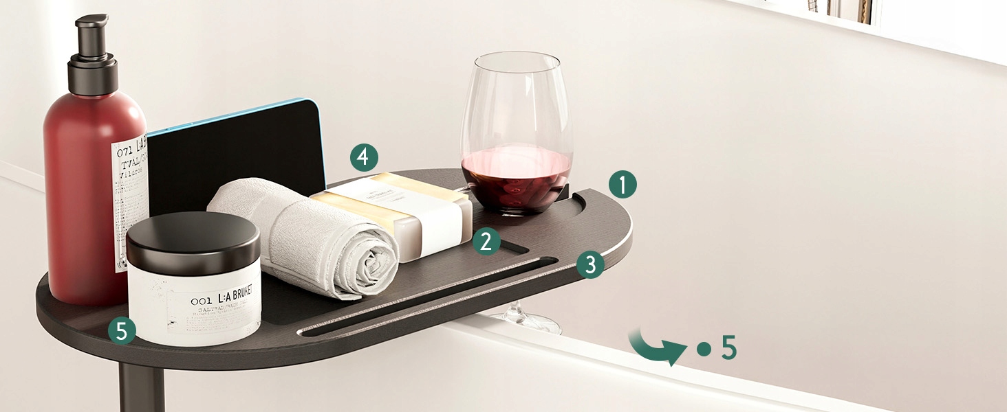 🛁🛁Різні відділення: передбачено 5 місць для зберігання найнеобхідніших речей для ванни, таких як телефон, планшет, келих для вина, чашки, мило, рушники, свічки, закуски, шампунь або будь-що інше, що вам потрібно. Тримайте всі необхідні речі для ванни під рукою, під рукою та в безпеці, щоб купатися приємно та комфортно.
