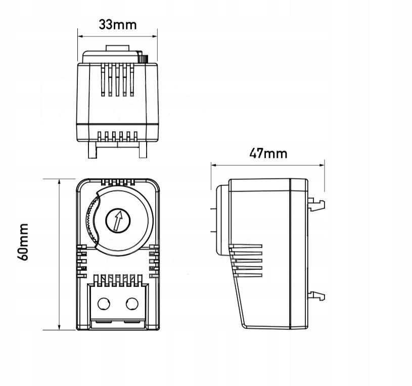 Технічні дані: - Тип датчика: біметалічний - діапазон регулювання: 0°C - 60°C - Макс. струм/напруга: 10А/250В - термін служби: бл - роз'єм: гвинтовий - корпус: пластик - кріплення: DIN-рейка 35 мм - розміри корпусу: 62x34x43 мм - робоча температура: -45°C - 70°C - ступінь захисту: IP20