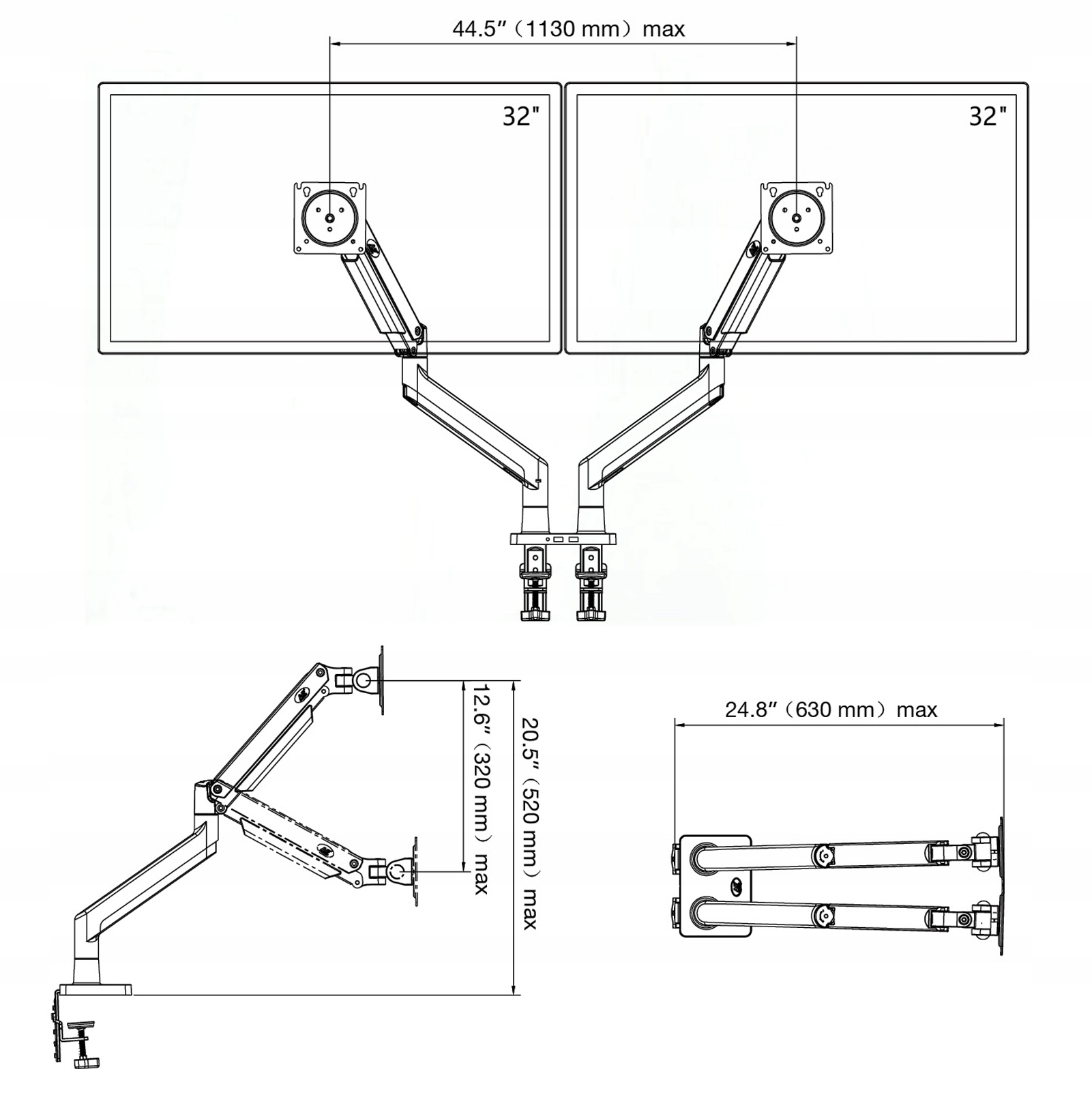 Поворотний настільний тримач для двох РК-світлодіодних моніторів з повним 3D регулюванням і плавним регулюванням висоти на газовій пружині.