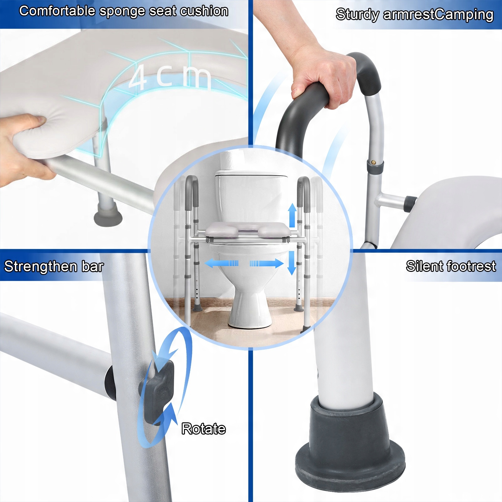 сидіння та стоячи. для звільнення стегна та стегна, м'яка подушка сидіння може дозволити приємний туалет. Виготовлений з стійкого до корозійного алюмінієвого сплаву, забезпечуючи безпеку та довговічність. надає надійну підтримку для користувачів комфортно та безпечно користуватися туалетом. Батеральна армована структура струни знижує ризик відсутності балансу стресу між двома ніг. під час вагітності та дорослих, які потребують різної висоти до туалету тощо