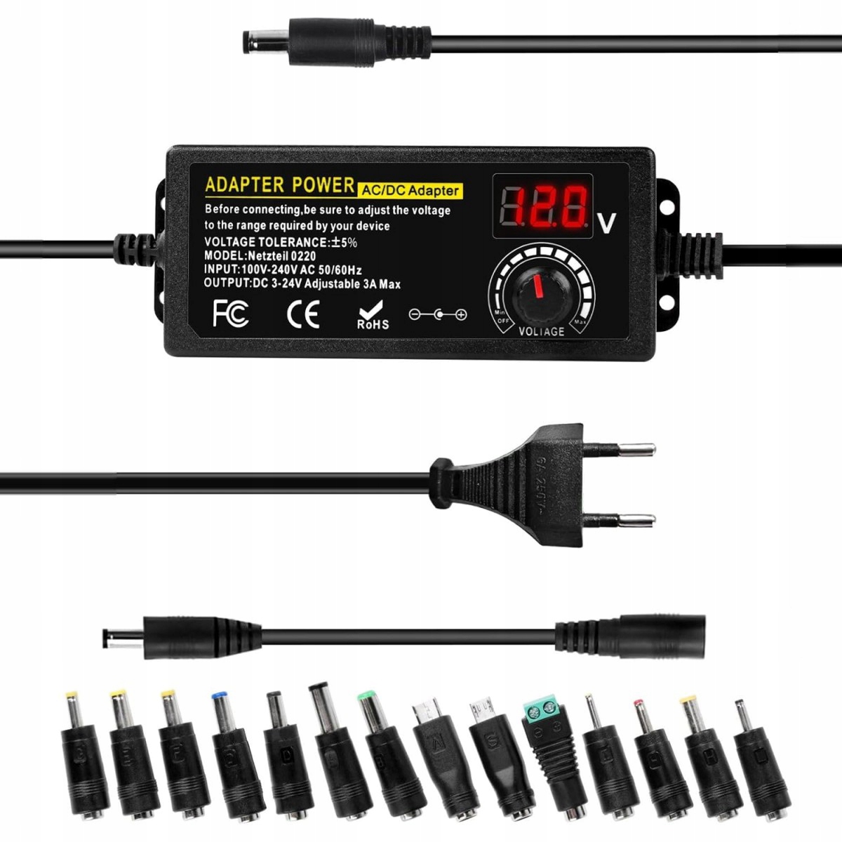 Вхід: 100 ~ 240 В змінного струму, 50/60 Гц, вихідна напруга 3 В ~ 24 В постійного струму, що регулюється. Максимальна потужність 3А, 72Вт; може видавати струми нижче 3 А, напр. 300 мА, 500 мА, 1 А, 1,5 А, 2 А, 2,5 А, 3 А. Виміряна вихідна напруга від 2,85 В до 25,2 В знаходиться в межах стандартного діапазону та є дійсною з допуском галузевого стандарту ±5%. Перш ніж підключати виріб, переконайтеся, що він сумісний із діапазоном напруги вашого пристрою.