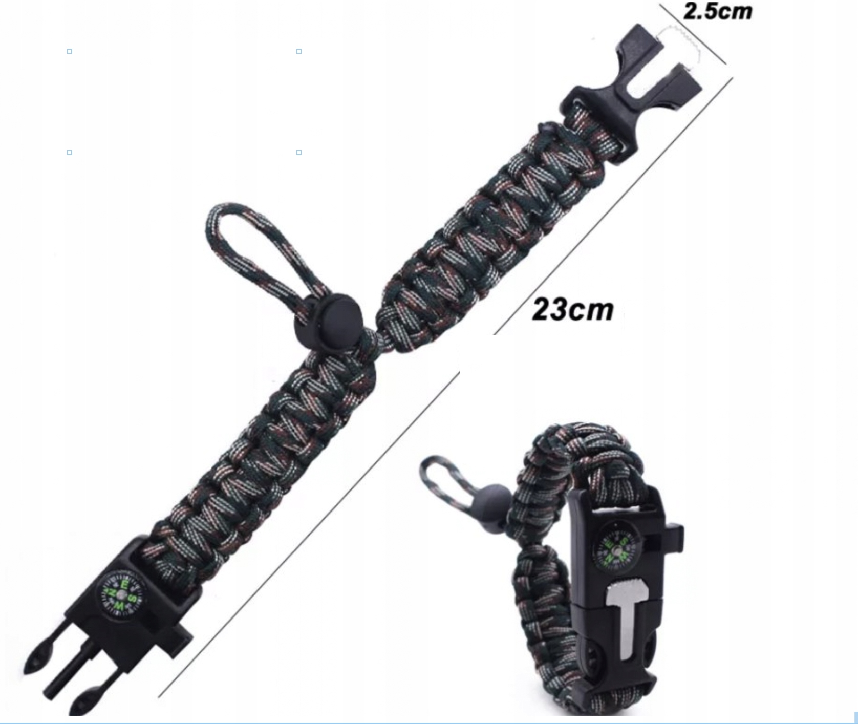 - кріплення браслетів : Застібка з кременем магнію, свистявий сигнал та міні -компас