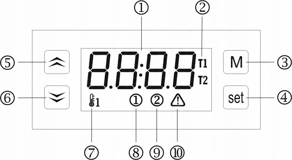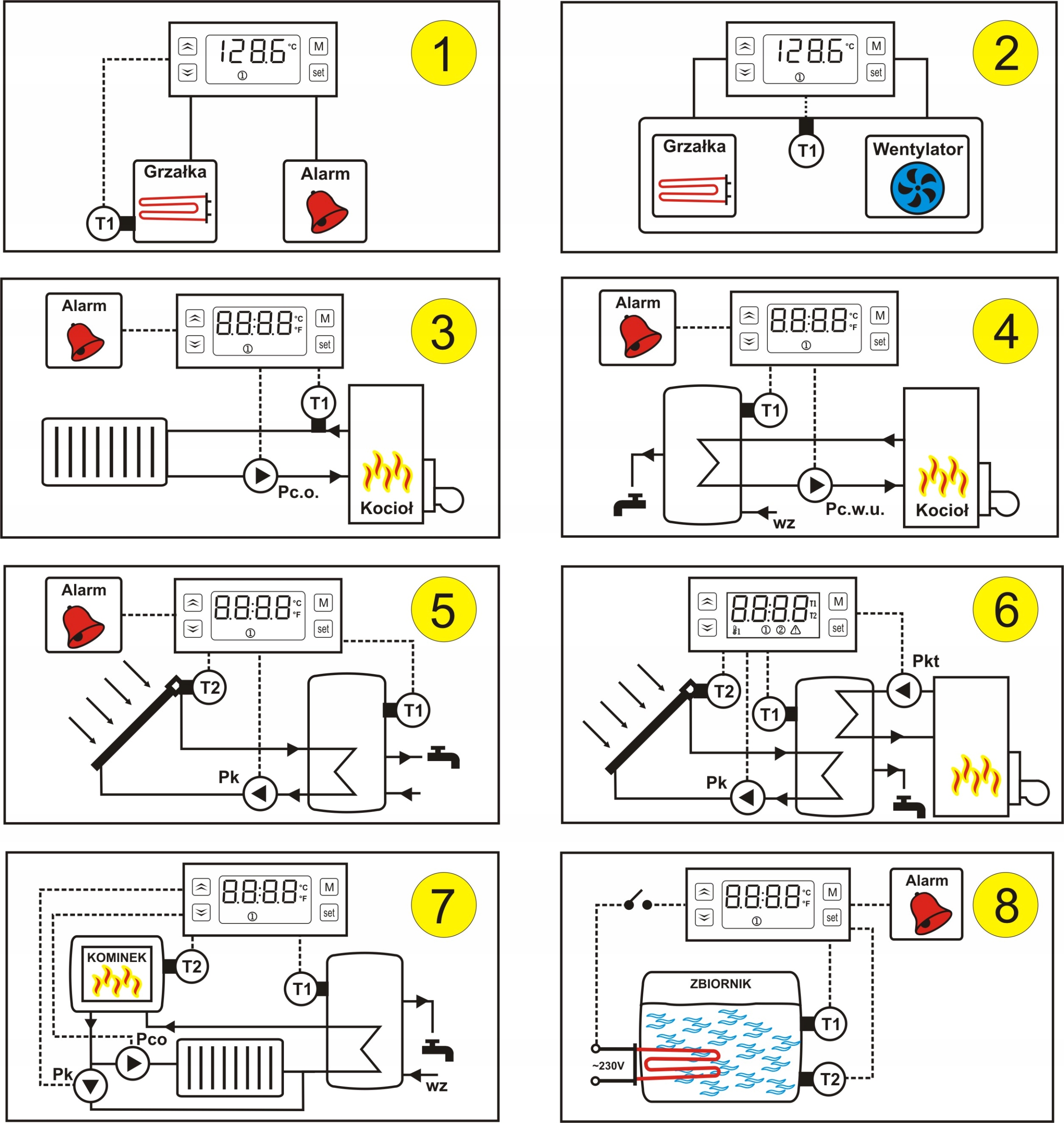 сигнал тривоги високої та низької температури при перевищенні, вихід допоміжного реле та буде активовано внутрішній зумер. Коли виникає сигнал тривоги, головний вихід можна заблокувати у положенні «увімк.» або «вимк.» (залежить від системи, наприклад, коли температура в каміні підвищується, насос потрібно ввімкнути, щоб охолодити контур).