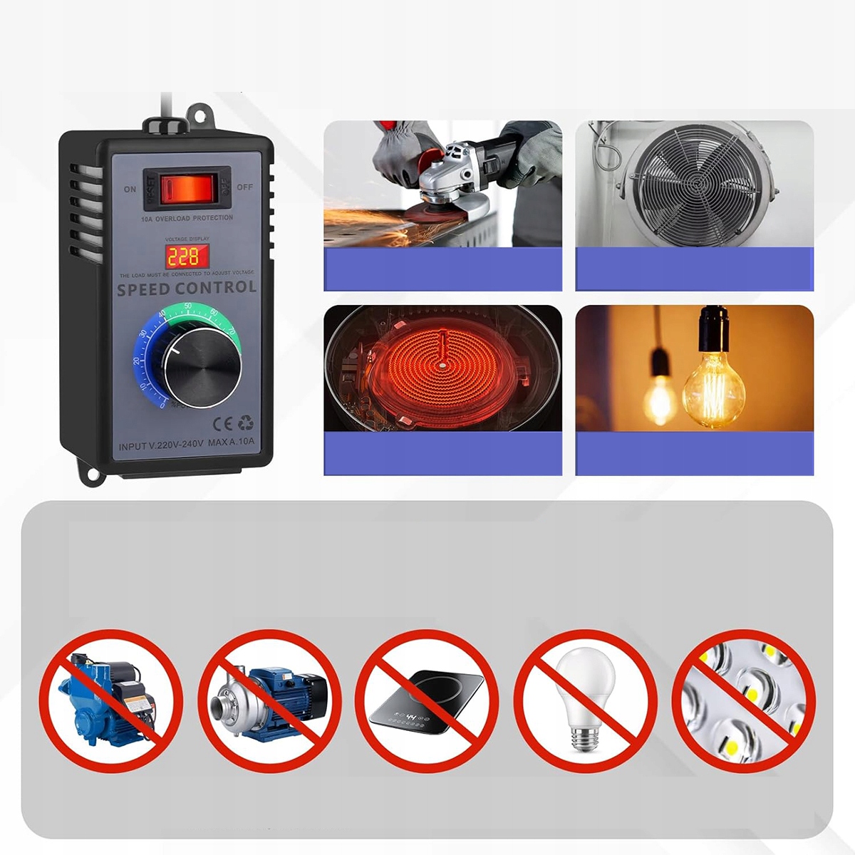 Регулятор швидкості має пікову потужність 4000 Вт. Максимальне підключене резистивне навантаження не може перевищувати 2000 Вт, максимальна потужність індуктивного навантаження не може перевищувати 500 Вт, а максимальна потужність ємнісного навантаження не може перевищувати 300 Вт, інакше продукт може бути пошкоджений.