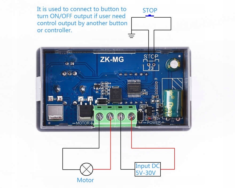 ШІМ-контролер для двигунів постійного струму з робочою напругою від 5 В до 30 В, які використовуються в машинах, транспортних засобах і вентиляторах. Керування здійснюється за допомогою імпульсної технології ШІМ, тому втрати потужності невеликі.