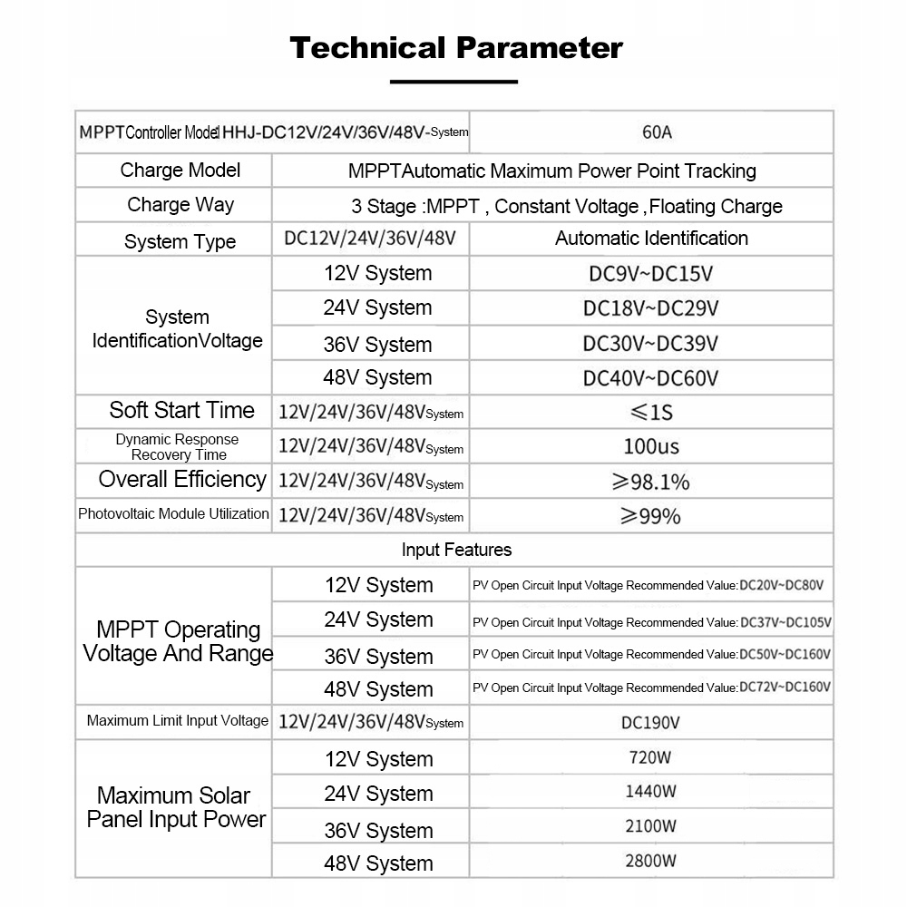 Регулятор MPPT стискається з панелі до 98% енергії, оскільки він постійно відстежує параметри роботи панелі та адаптує навантаження для досягнення найбільшої можливої потужності, отриманої на даний момент. Upbating 98-99% is much more than in 48V solar hybrid inverters where the efficiency is at the level of 90-97%,