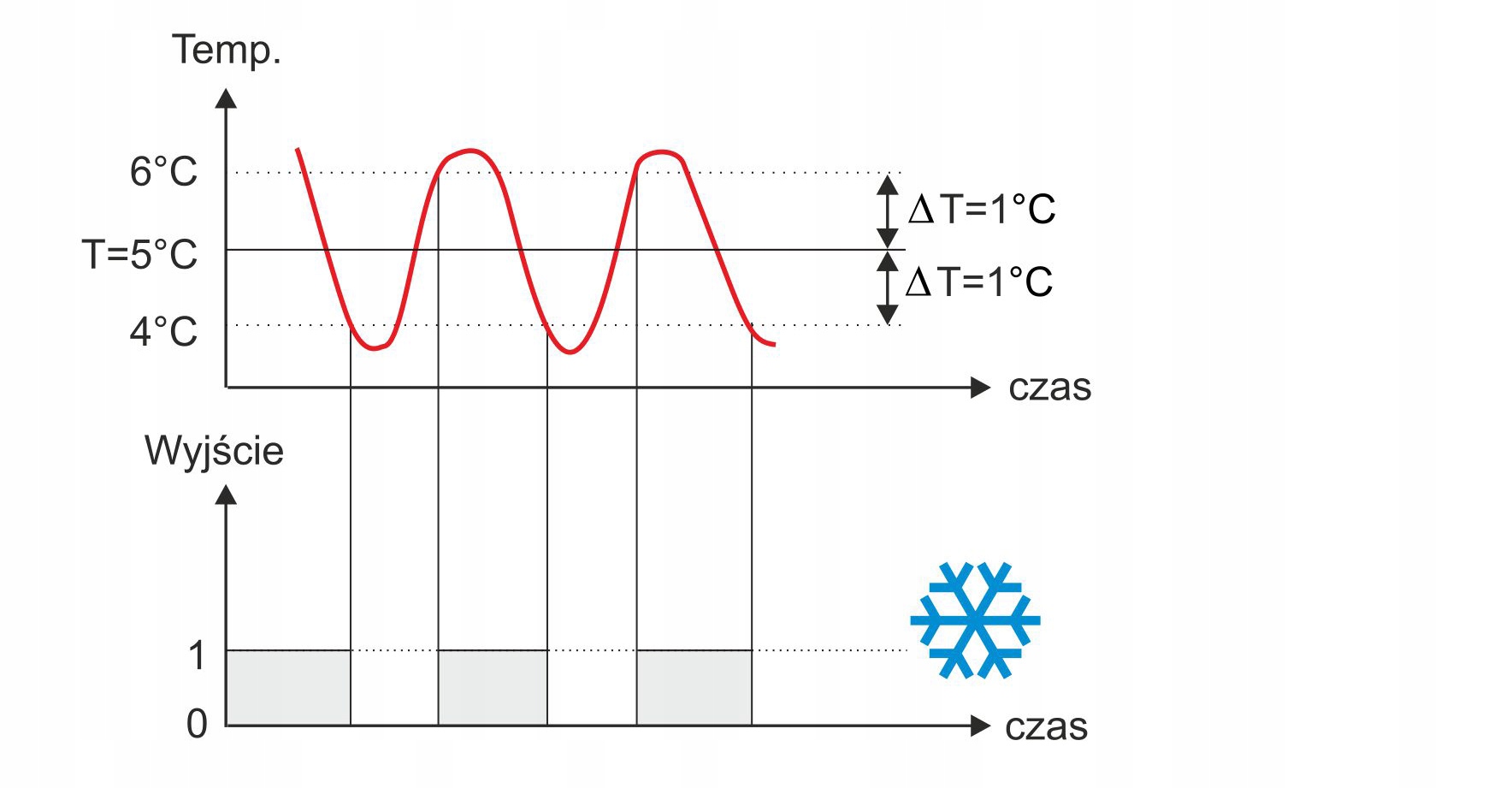 Контролер використовується для підтримки температури T із заданим гістерезисом T в холодильних або нагрівальних приладах. Привід керується через релейний вихід, а температура вимірюється за допомогою датчика температури.