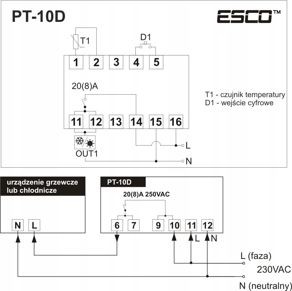 Контролер температури на DIN-рейку з вимірювальним входом Pt100, універсальний з функцією нагрівання/охолодження та сигналізацією MIN і MAX, NO: PT10D