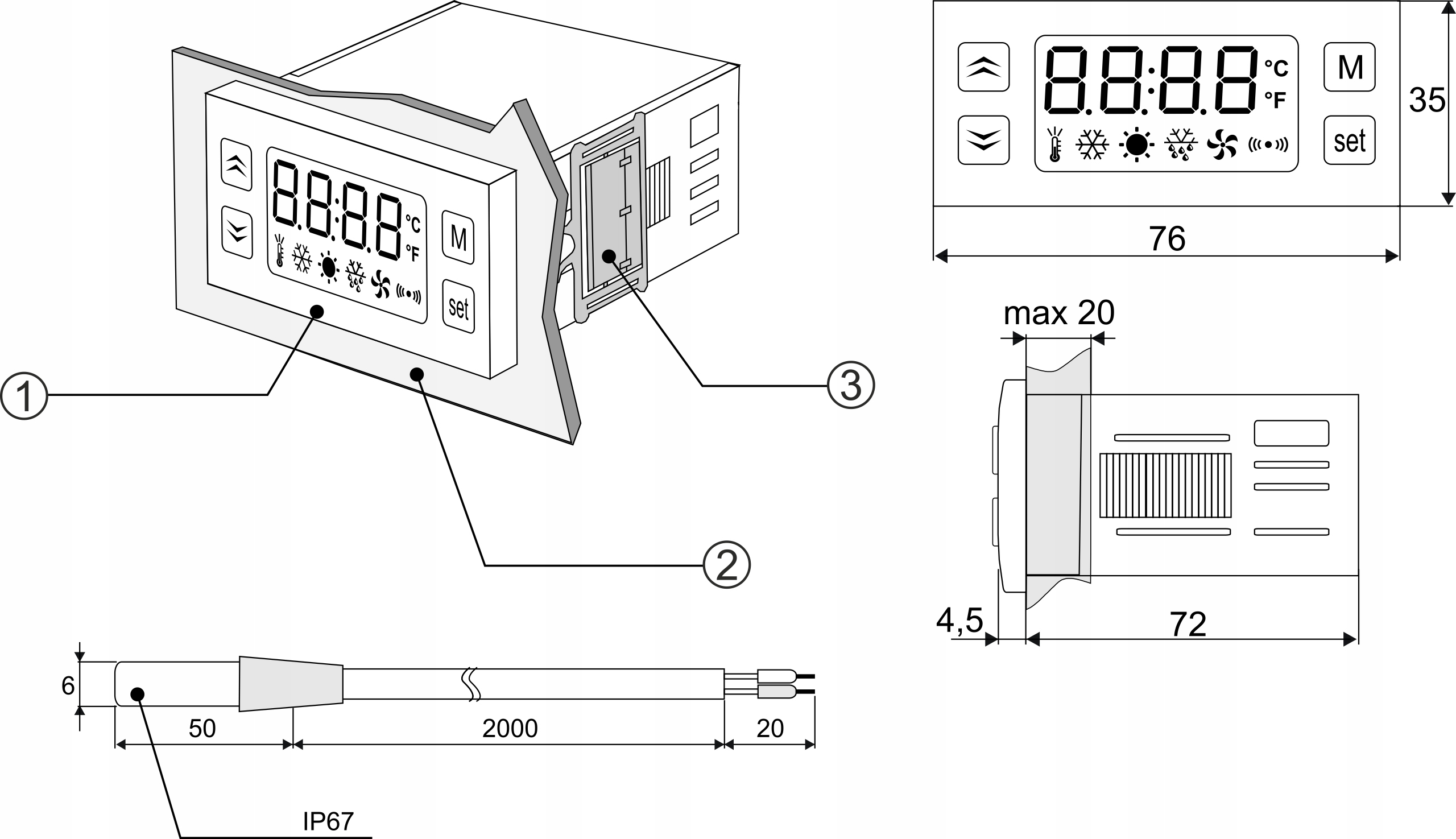 Контролер має цифрове зчитування температури та функцію калібрування індикації. Використовувався метод управління включення/виключення (ON-OFF) з регульованим гістерезисом. Контролер оснащений потужним релейним виходом керування 20A (максимальне резистивне навантаження 4500W). Режим роботи: "обігрів" або "охолодження" встановлюється в меню. Установка в панель або герметичний настінний корпус.