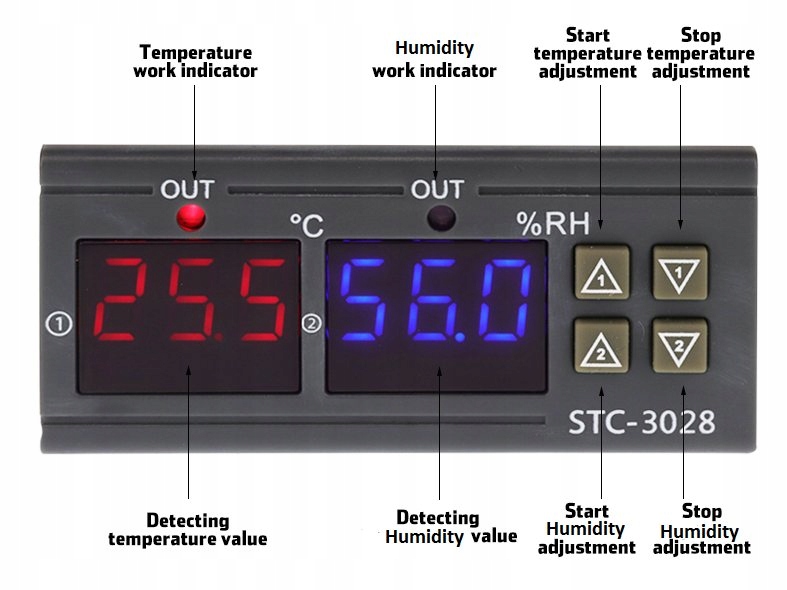 Контролер має два світлодіодні дисплеї: 1 червоний, який відображає температуру, і 2 синіх, який відображає вологість.