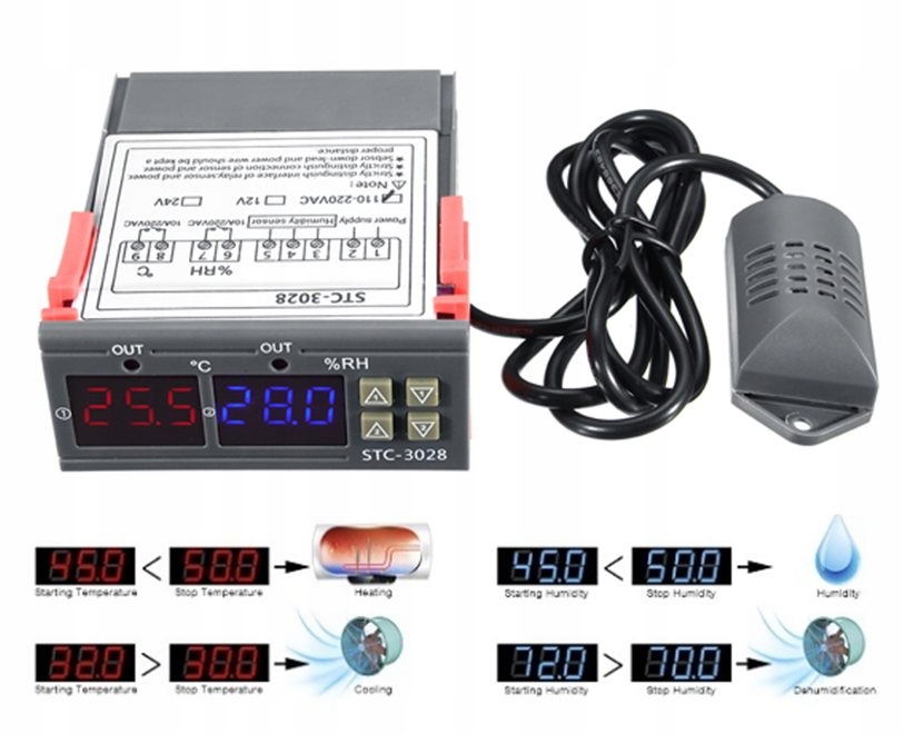 Датчик вологості та температури STC-3028 є рішенням для використання в багатьох проектах, де необхідно одночасно контролювати вологість повітря та температуру, наприклад: на складах, виробничих цехах, сушильних камерах, оранжереях і музеях.