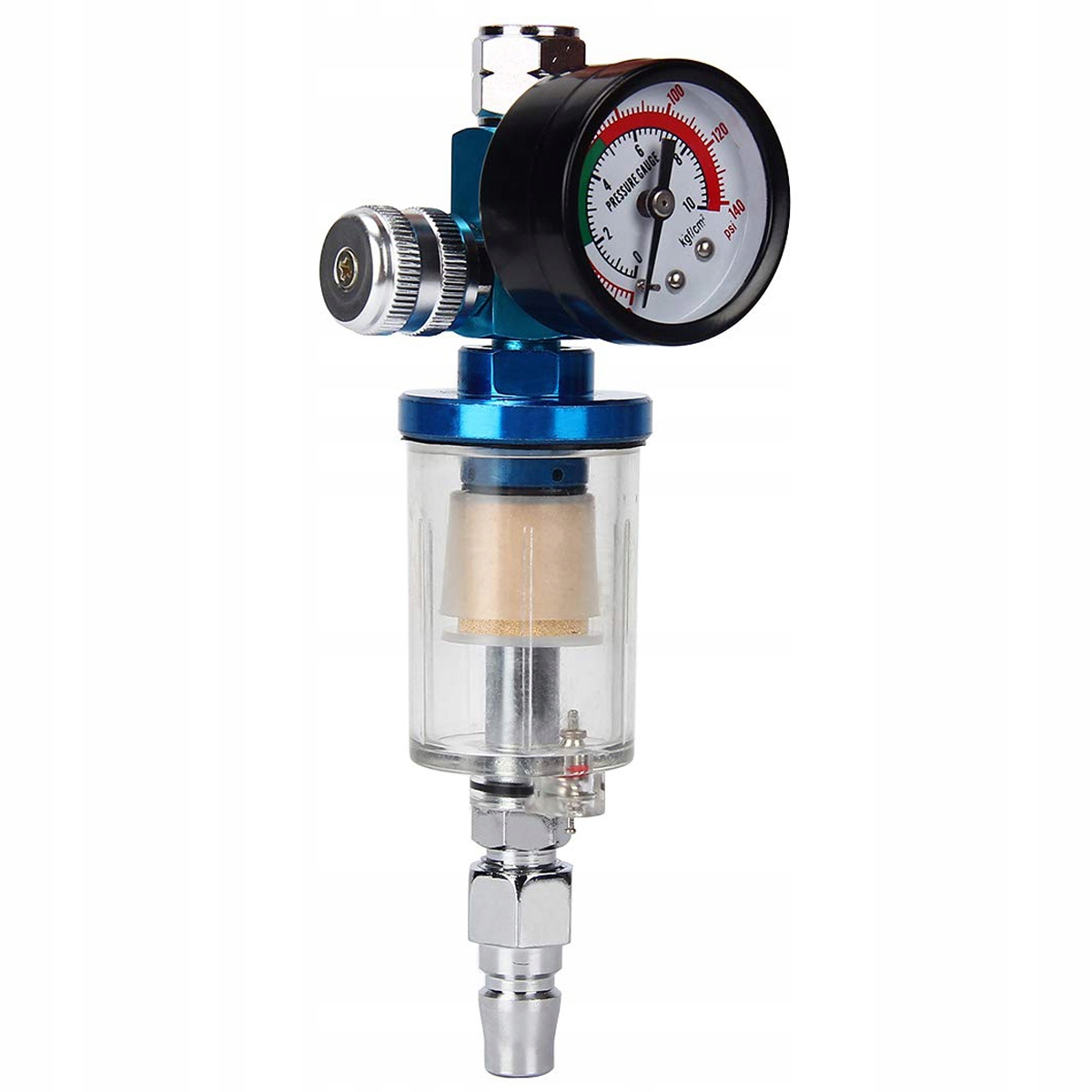 Прозорий фільтр дозволяє візуально контролювати накопичену вологу. Зручно контролювати і регулювати значення тиску в реальному часі. (Дно має пружинний клапан скидання.)