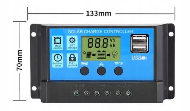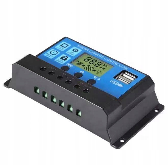 Сонячний регулятор і контролер зарядки для фотоелектричних панелей 12/24 В з РК-дисплеєм і портами USB.