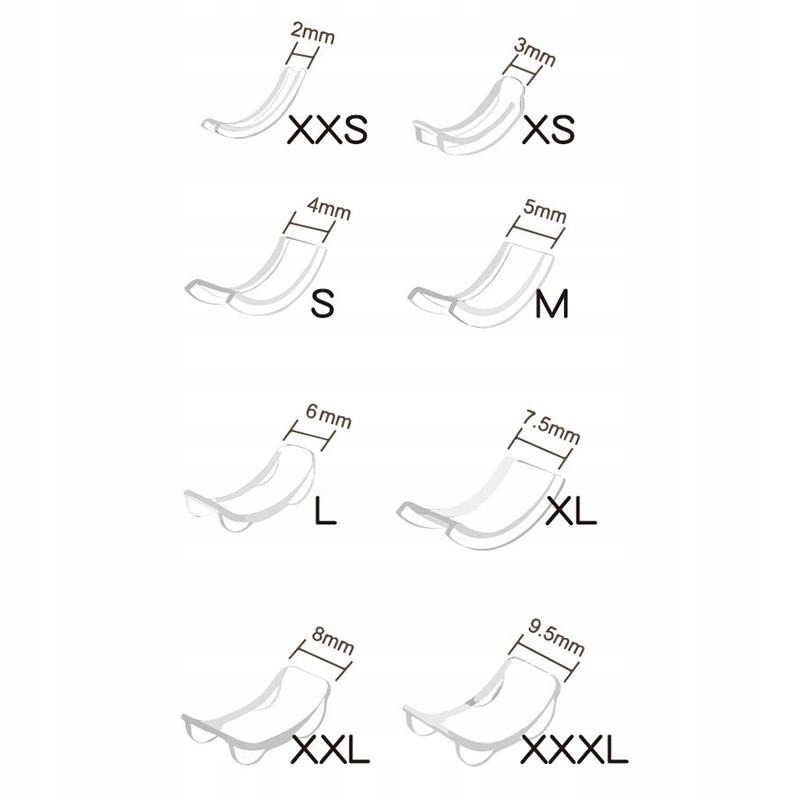 xxs - 2 мм, xs - 3 мм - 3 мм, s - 3,5 мм, m - 5 мм, l - 6,5 мм, xl - 7,5 мм, xxl - 8 мм, xxl
