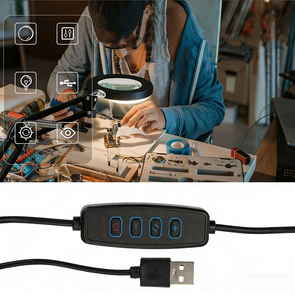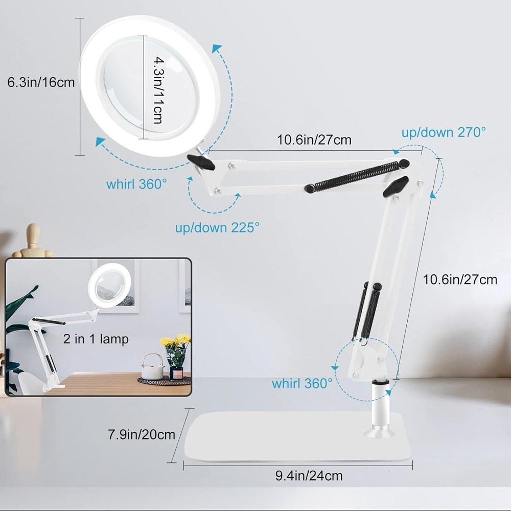 🔍Лупа з регульованим поворотним кронштейном:Лупу з підсвіченою рукою можна відрегулювати в будь-якому положенні. Головка, що обертається на 360 градусів, забезпечує широкий кут огляду. Дві металеві руки обертаються на 270 градусів. Збірка лупи займає лише 5 секунд, звільняючи ваші руки, щоб насолоджуватися читанням газет, шиттям, ремонтом, виготовленням ювелірних виробів та іншими видами мистецтва, рукоділля та хобі.