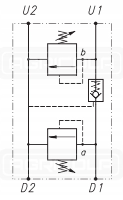 Клапан має чотири гідравлічні порти, які використовуються для регулювання тиску в пресах SIPMA. Клапан дозволяє контролювати тиск в магістралях U1 і U2. Коли тиск перевищує налаштування пружини, клапан відкриває потік до другої лінії. Контрольований зворотний клапан відкривається при подачі тиску на лінію U1 або U2.