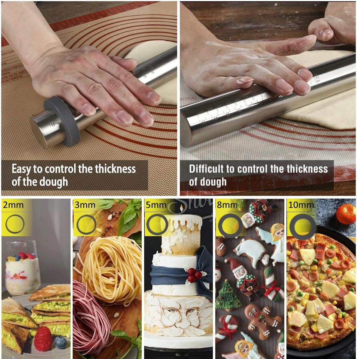 ✅ РЕГУЛЬОВАНИЙ ВАЛОК ДЛЯ РОЗКОЧУВАННЯ ТІСТА: Завдяки можливості регулювати товщину розкочування цей ролик дозволяє ідеально адаптуватися до різноманітних видів випікання та потреб, пропонуючи гнучкість у створенні вашої кухні.