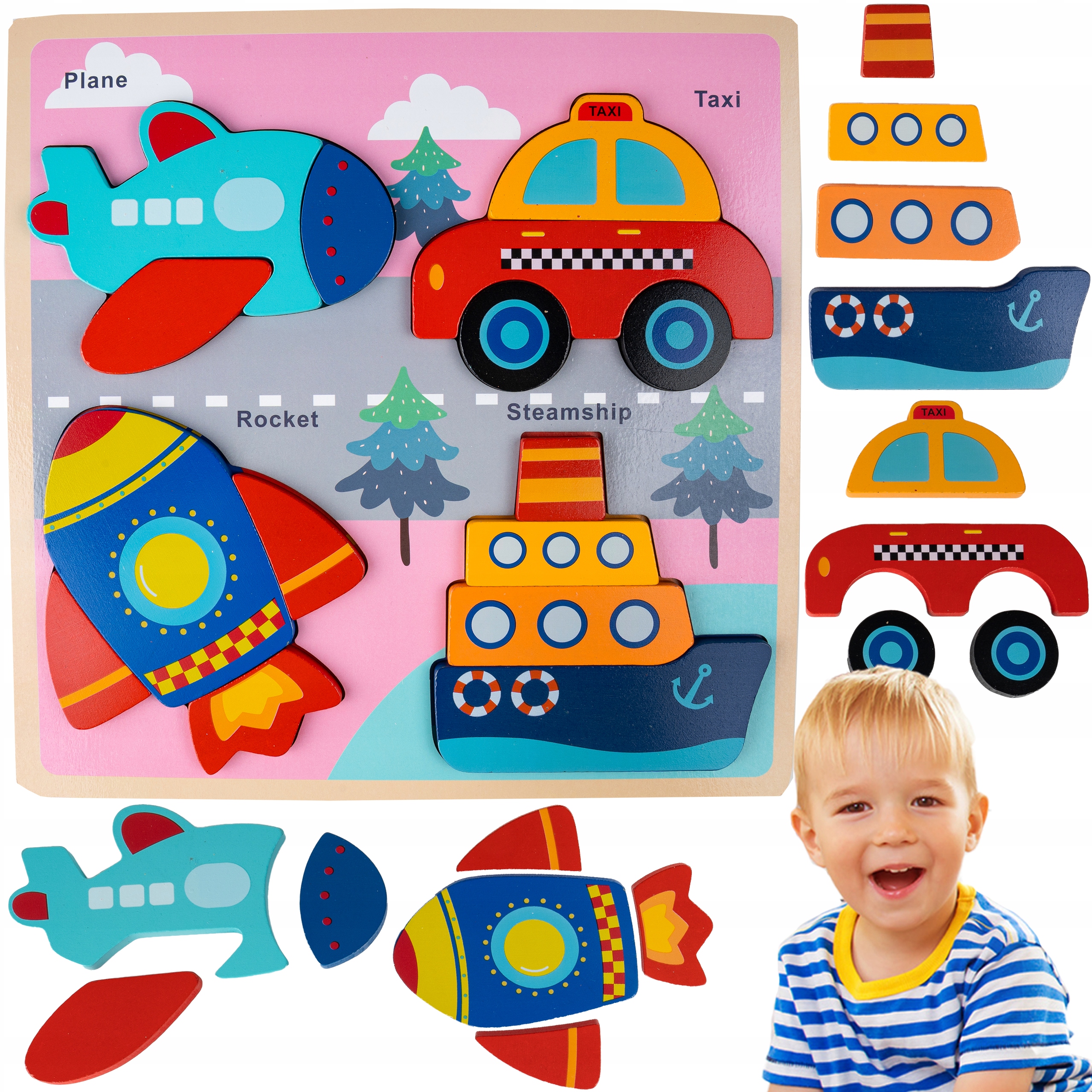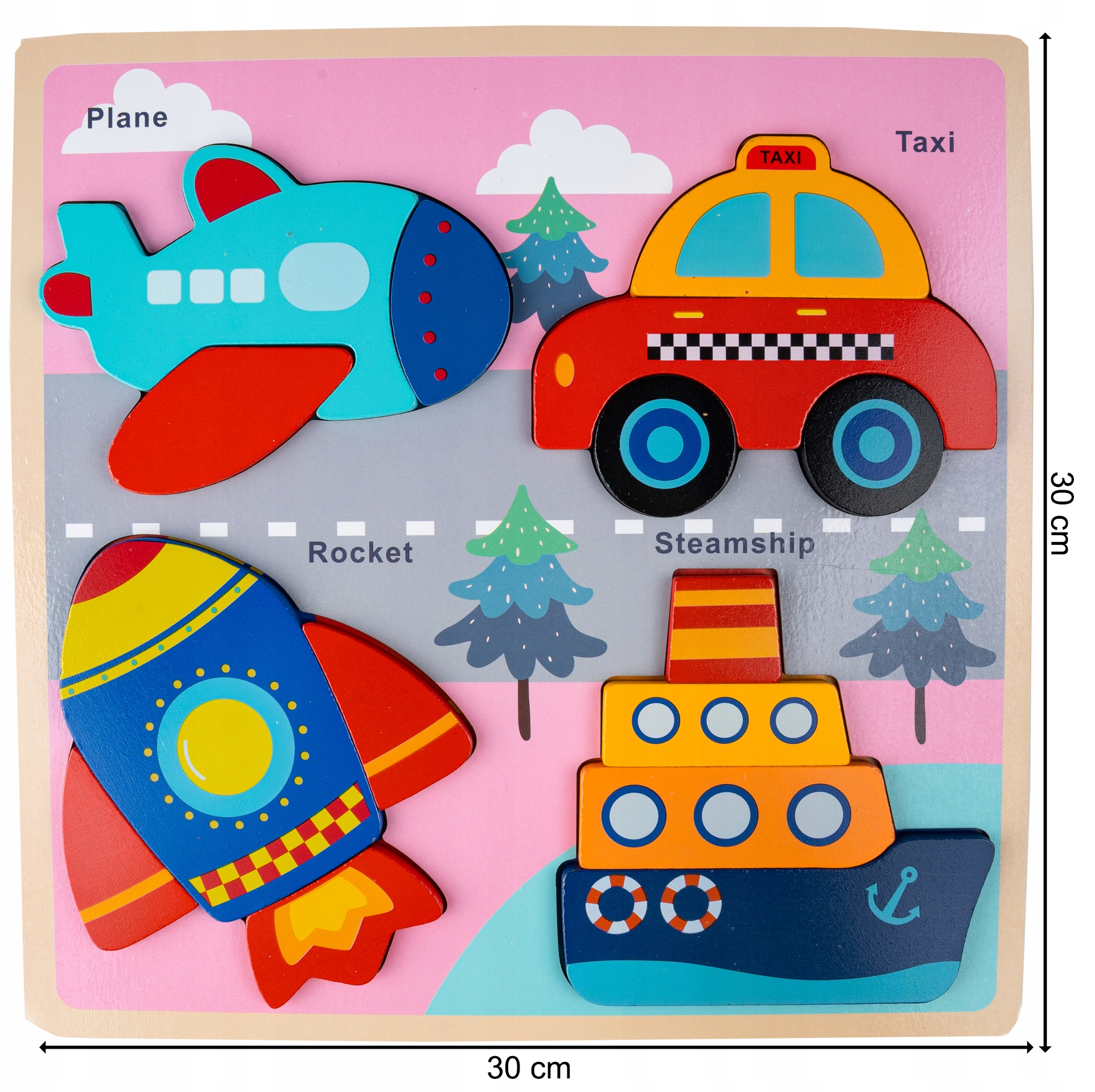 Дерев’яні пазли для вивчення того, як виглядає машина, літак, ракета чи корабель. Це спрощує роботу для дітей, які тільки починають свою пригоду з дослідження та вивчення відповідності