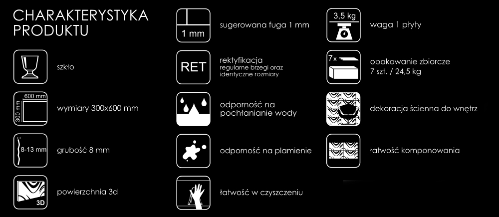 Завдяки суворішим виробничим стандартам, що застосовуються під час виробництва окремих стекол, кожен покупець може бути впевнений в однакових розмірах. Кожне скло є прямокутником і має розміри 60x30 см. Його краї рівні та прямі, а краї гострі (без заокруглень). Це результат ректифікації, тобто піддавання кожної скляної панелі процесу, під час якого краї скляних плиток механічно обробляються для забезпечення прямолінійності та правильності кута кожної 3D-склянки.