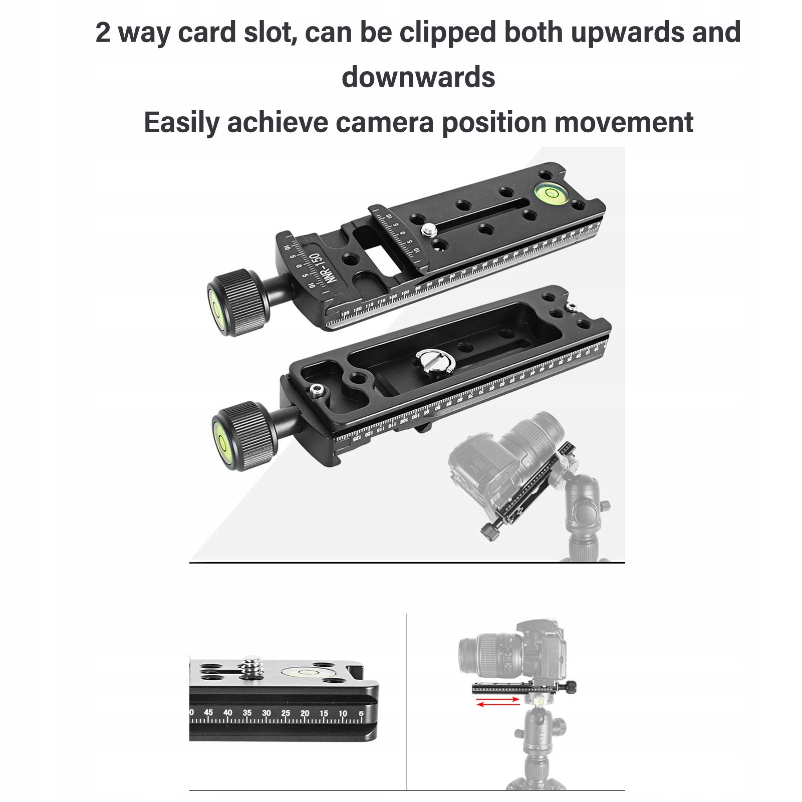 1. Пис швидкого випуску з рівнем: слайдер залізничного вузла-це 38-мм стандарт для ARCA з 2-вуглецевою розеткою, яка стимулює регулювання камери. Він сумісний з Arca Ball Gowicy без необхідності зняти камеру, що робить її ідеальною для панорамної фотографії та макросу.