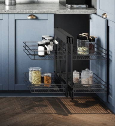 Кутові кошики дозволяють максимально ефективно використовувати простір шафи, одночасно полегшуючи доступ до продуктів, які в них зберігаються.