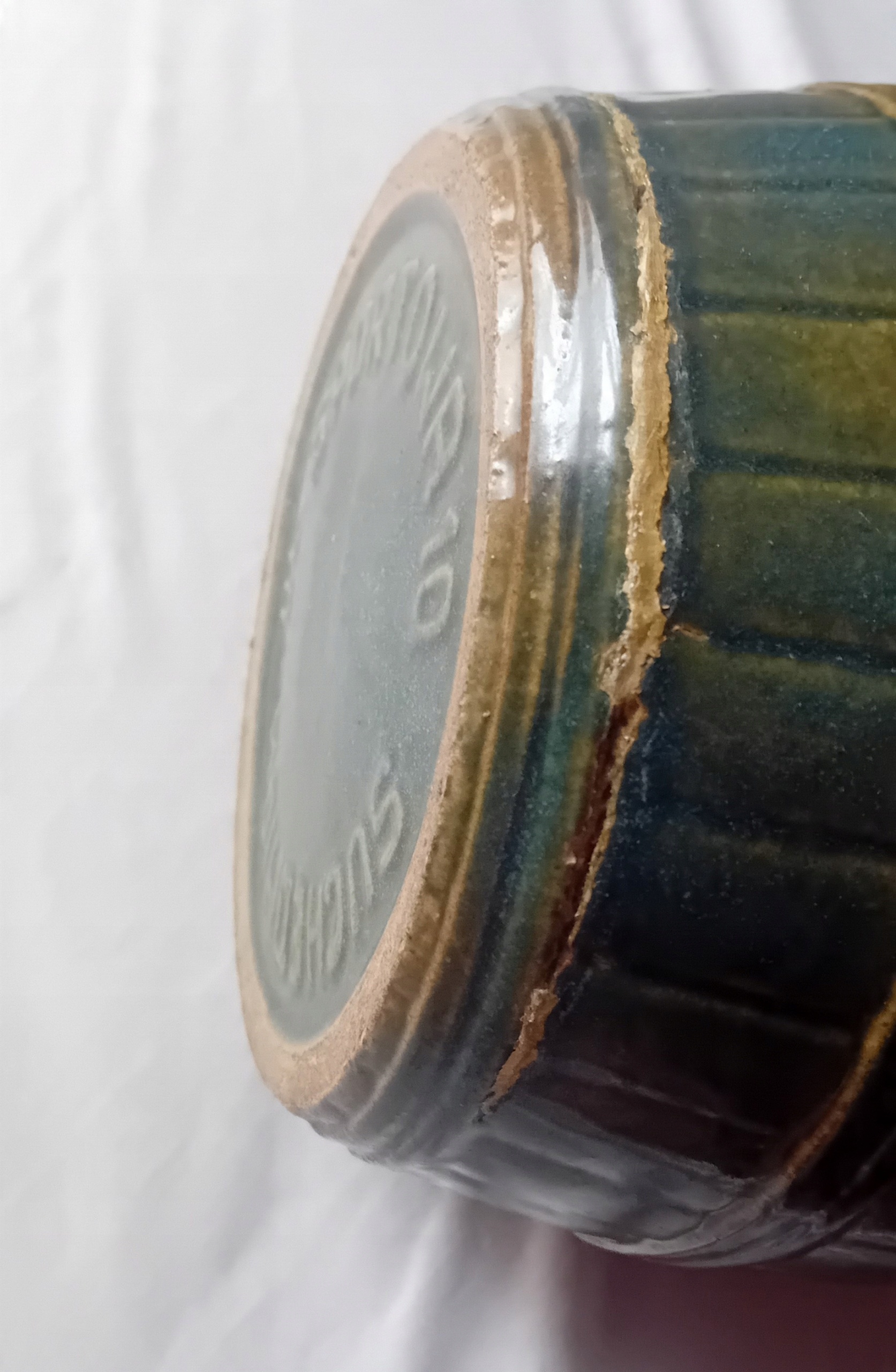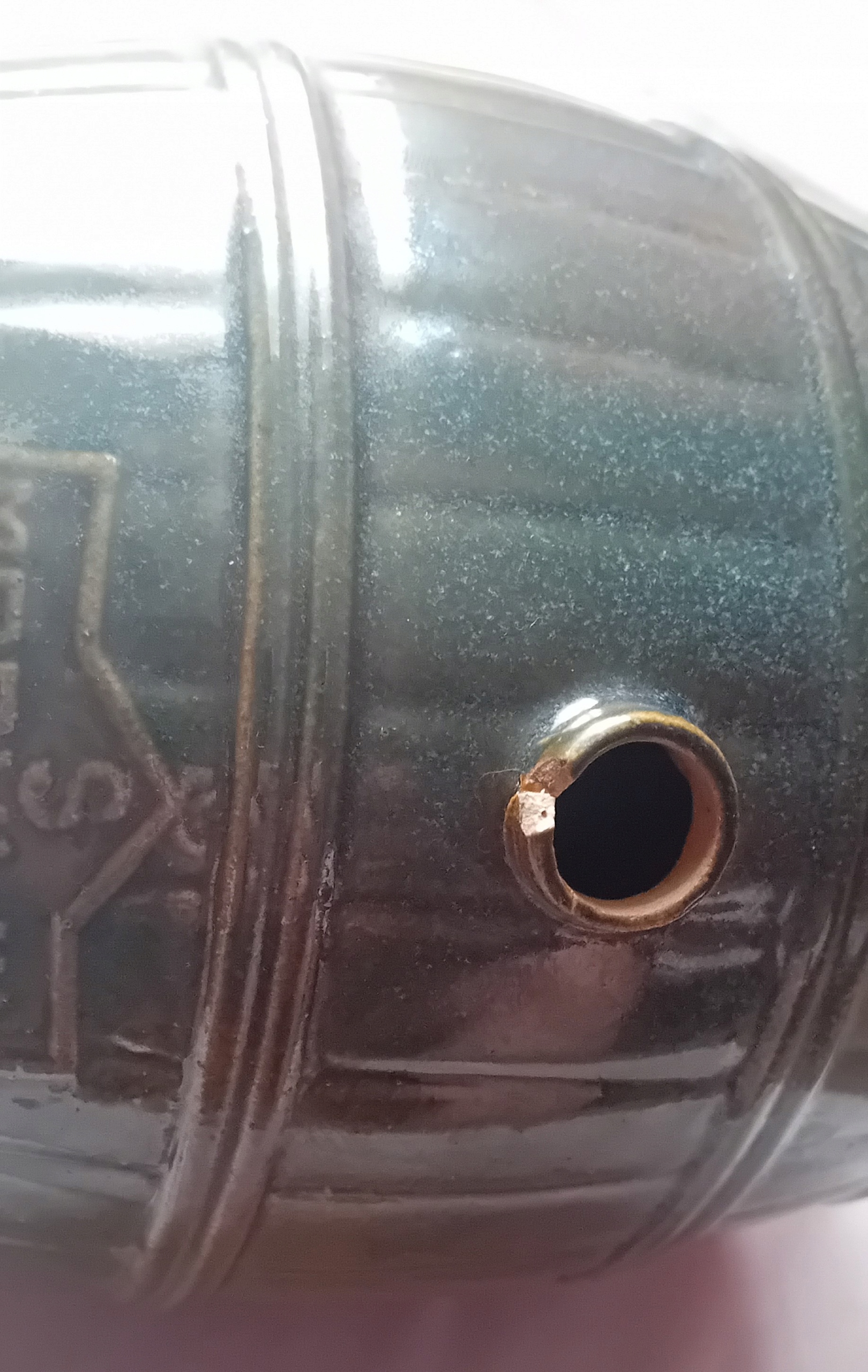 Я продаватиму рідкість колекціонера - рекламне керамічне виробництво бочки Marywil Kamionkowe продуктів у Субедніу. Нижче Мерівіл спеціалізується на виробництві глазурованих труб та кам'яних корита. Компанія була заснована в 1920 -х роках. У 1950 році він був приватизований і діяв донині. У період, коли компанія була приватною власністю, завод випускав випадкові предмети, включаючи бочки, передані у вигляді подарунків більшим покупцям. Це одна з таких випадкових продуктів. Засклена бочка зеленим кольором, ємність близько 3,5 літрів. Довжина (або висота) 17,5 див. Діаметр 15 / 18,5 / 15 см. Бочка, оснащена краном та штепсельною вилкою, підтримується на дерев’яній підставці. Середній стан - нижній та тригерний кран склеєні, що можна побачити на знімках. Край інфузії відбивається, і обидва пробки мають дефекти емалі, показані на знімках. На фотографіях показані факти.