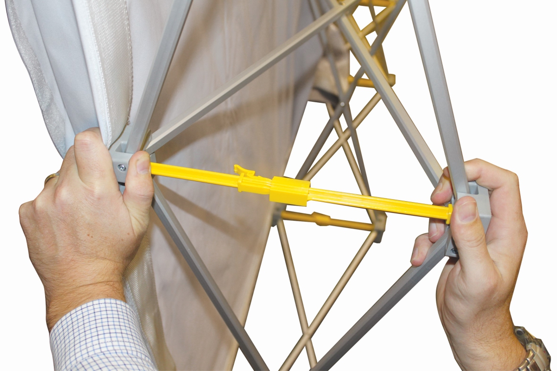 Текстильна розтяжна стіна Hop-Up - це нова форма подання графіки у великому форматі. Легка і портативна система, проста в установці, забезпечує максимальний ефект з мінімальними зусиллями. Елементи виготовлені з алюмінію та пластику, а їх збірка надзвичайно проста. Система дозволяє представляти графіку з тканини, яка натягнута на раму.