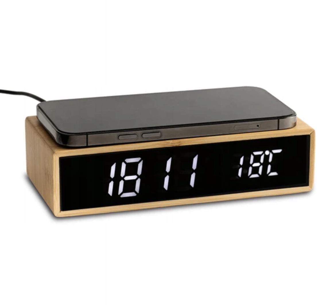 Індукційний зарядний пристрій з годинником, також відображає дату та температуру. Працює від USB -кабелю (включений). Зарядний пристрій працює з телефонами з функцією індукційної зарядки. Сила: 10 Вт. Телефон не додається.