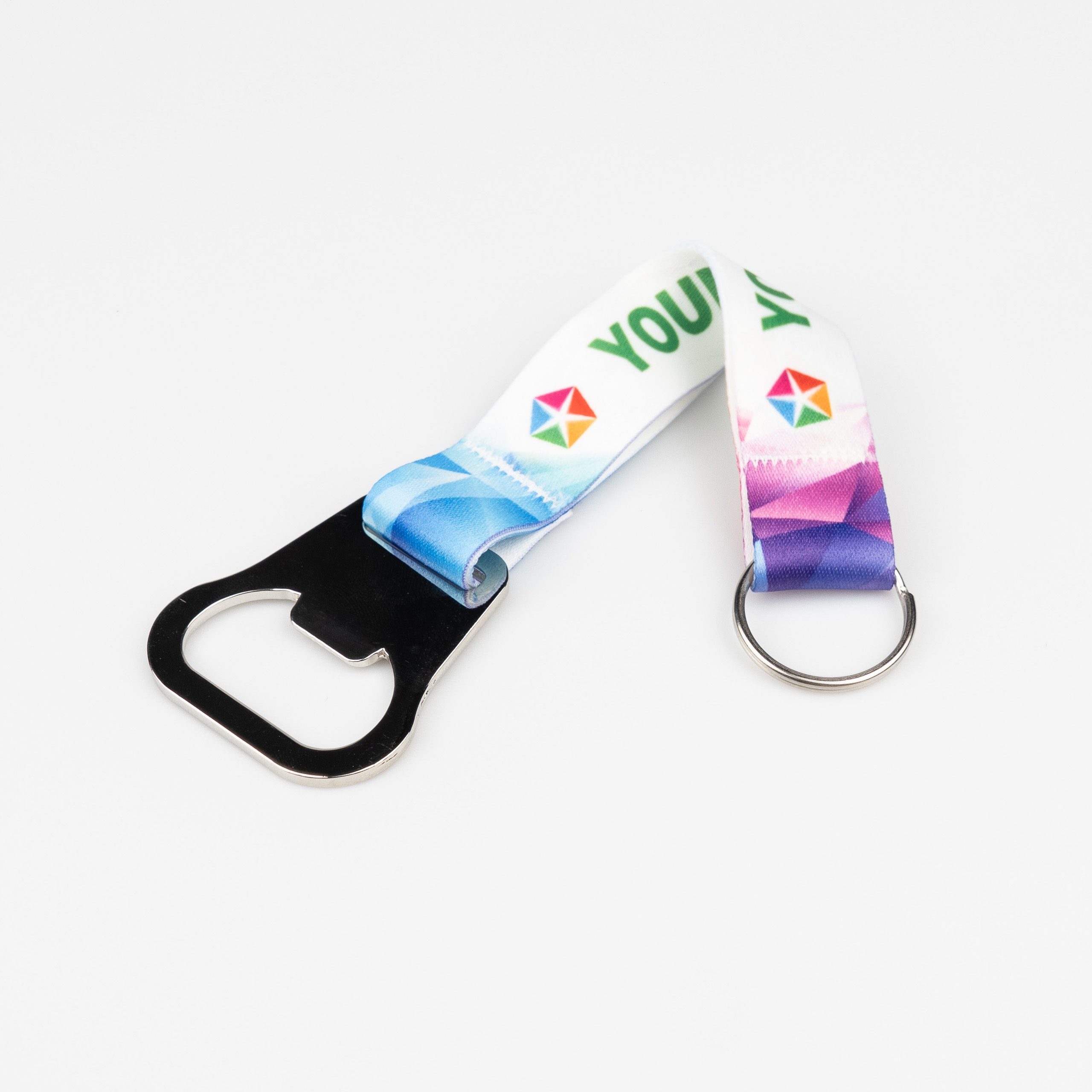 гаджет, який завжди буде використовуватися, і, таким чином, буде вітальним рекламним подарунком. Цей ключовий різьблений кільце закінчився відкривачем, крім очевидного використання, він ідеальний як ключовий кулон завдяки класичному гачку. Широка поліефірна стрічка забезпечує велику рекламну поверхню. Щоб підняти престиж цього гаджета, можна зробити лазерне позначення на самій металевій відкриття.