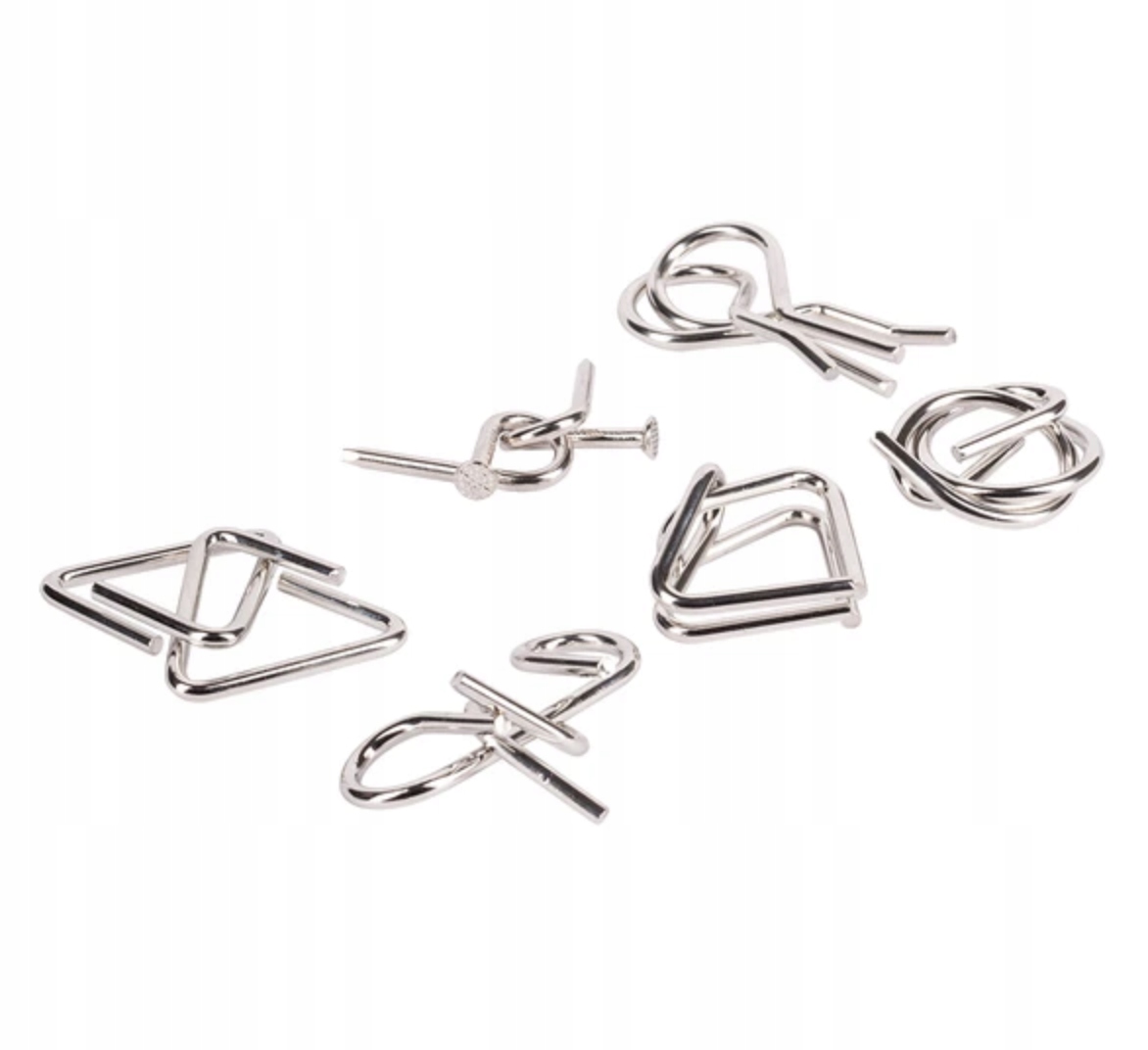 Набір, що складається з 6 пар металевих головоломок у дерев’яній коробці.