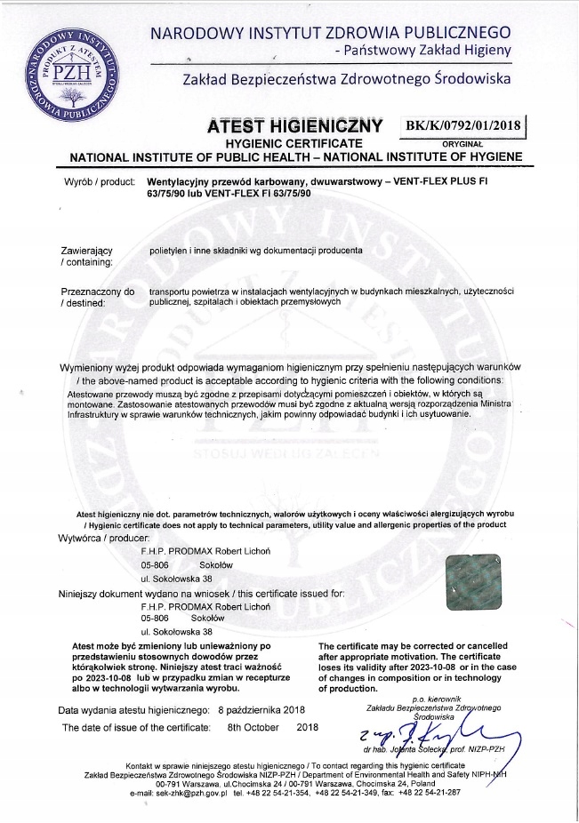 Канал ВЕНТ-ФЛЕКС призначений для транспортування припливного та витяжного повітря в системах механічної вентиляції житлових будинків. Труба випускається в двох варіантах - ВЕНТ-ФЛЕКС і ВЕНТ-ФЛЕКС ПРЕМІУМ. Внутрішнє покриття має протигрибкові та бактерицидні добавки. Тривалий мікробіологічний захист (ефективність ≥ 99,98%) забезпечують наночастинки срібла (Ag) і кремнезему (SiO2).Внутрішня частина шар також має антистатичні добавки, що обмежує осідання та накопичення пилу. Двошарова труба характеризується високою гнучкістю, що дозволяє дуже універсально розподілити систему вентиляції. Конструкція труби забезпечує високу міцність, що дозволяє, наприклад, заливати бетоном.