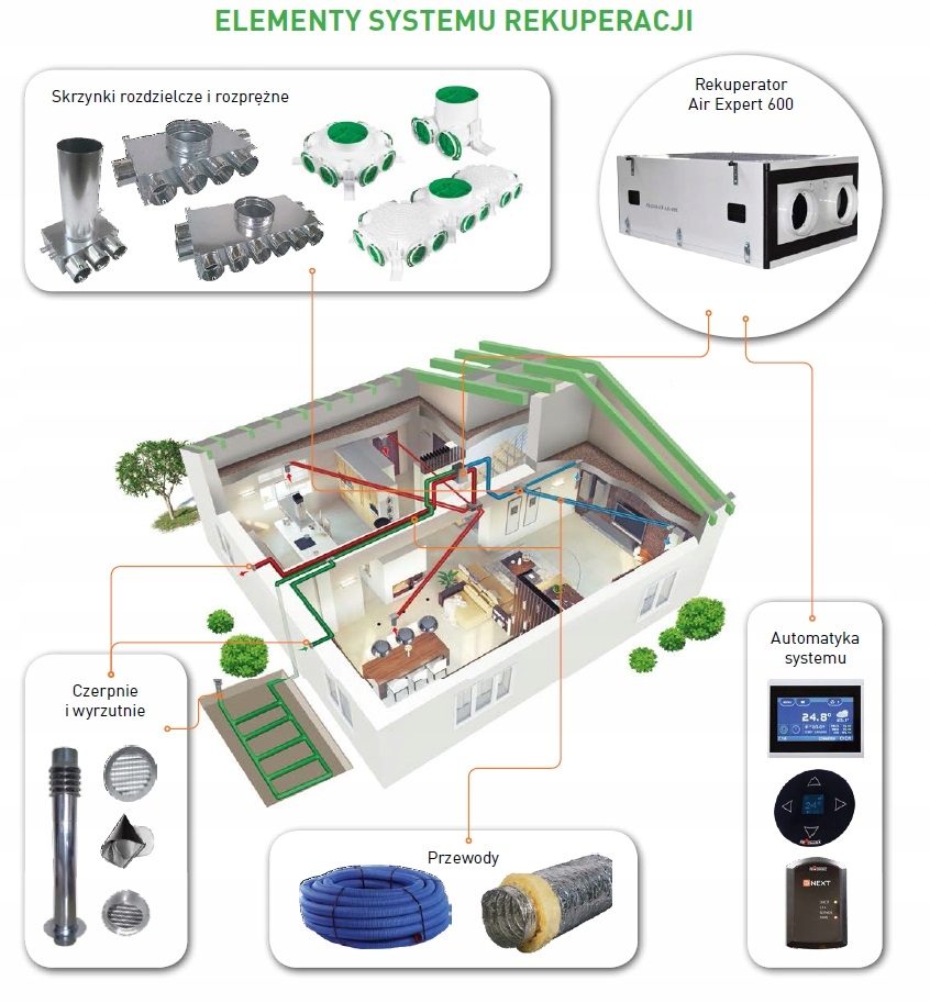 Зверніть увагу, що наша пропозиція включає всі елементи, необхідні для створення повної, правильної механічної вентиляційної установки (повітряні клапани, коробки, розподільники, кабелі, ущільнювачі, кришки, монтажні матеріали та припливні установки).