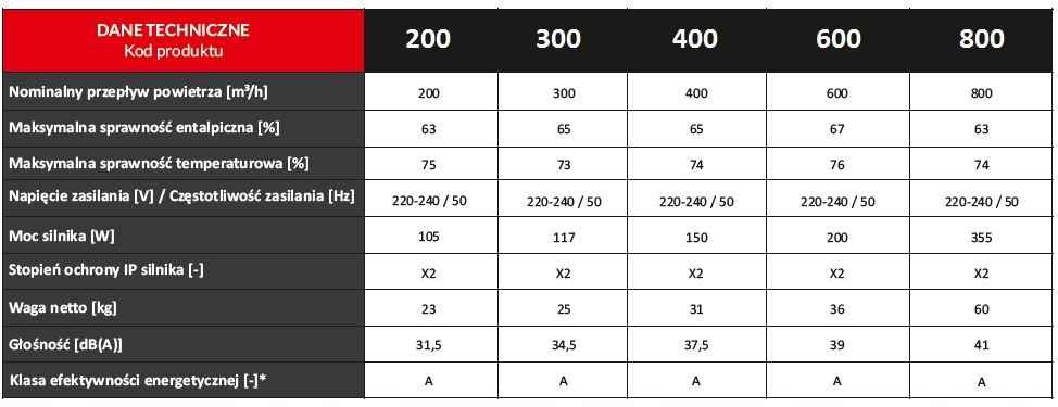 - 3-швидкісні вентилятори змінного струму (припливний і витяжний працюють одночасно), G3 pre- фільтри, що захищають теплообмінник від швидкого забруднення (порівняно зі стандартними рекуператорами - немає фільтра F9 і відповідного реле тиску),