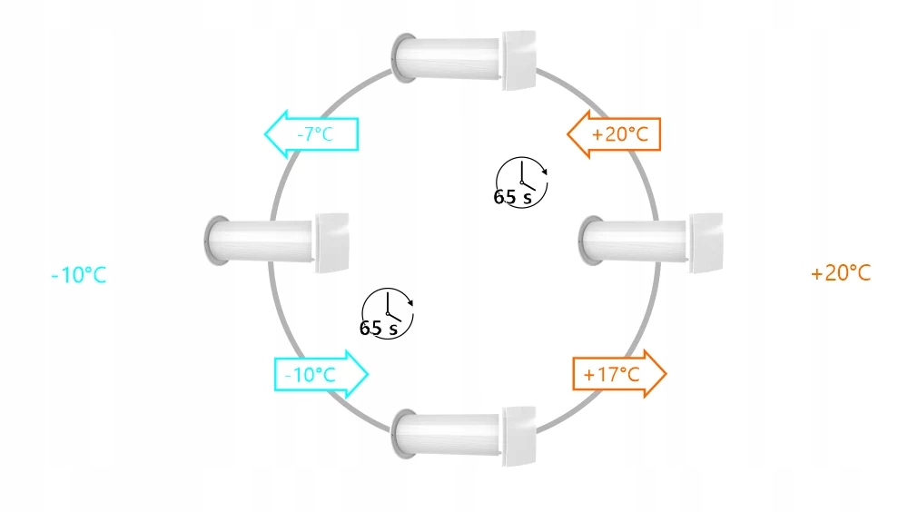 - Цикл I: Тепле старе повітря видаляється з кімнати. Проходячи через теплообмінник, він нагріває і зволожує теплообмінник, передаючи до 90%. Протягом 65 секунд, коли керамічний теплообмінник нагрівається, рекуператор переходить у режим подачі.