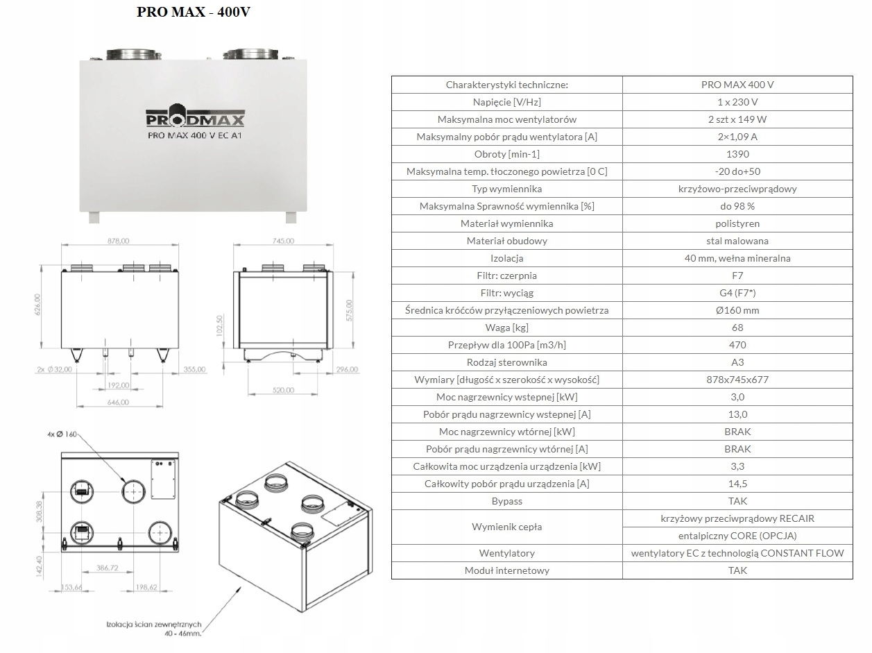 Рекуператор PROMAX 400 V - це комплектний вентиляційний пристрій з вертикальним розташуванням патрубків, який використовується для вентиляції односімейних будинків або комерційних об'єктів. Продуктивність до 480 м3/год.