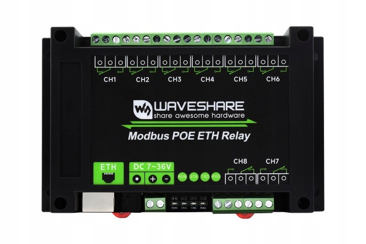 Цей продукт є 8-канальним промисловим релейним модулем, який керується через порт Ethernet, використовує протоколи Modbus RTU/Modbus TCP, підтримує джерело живлення PoE та поставляється з корпусом із ABS для монтажу на рейці.