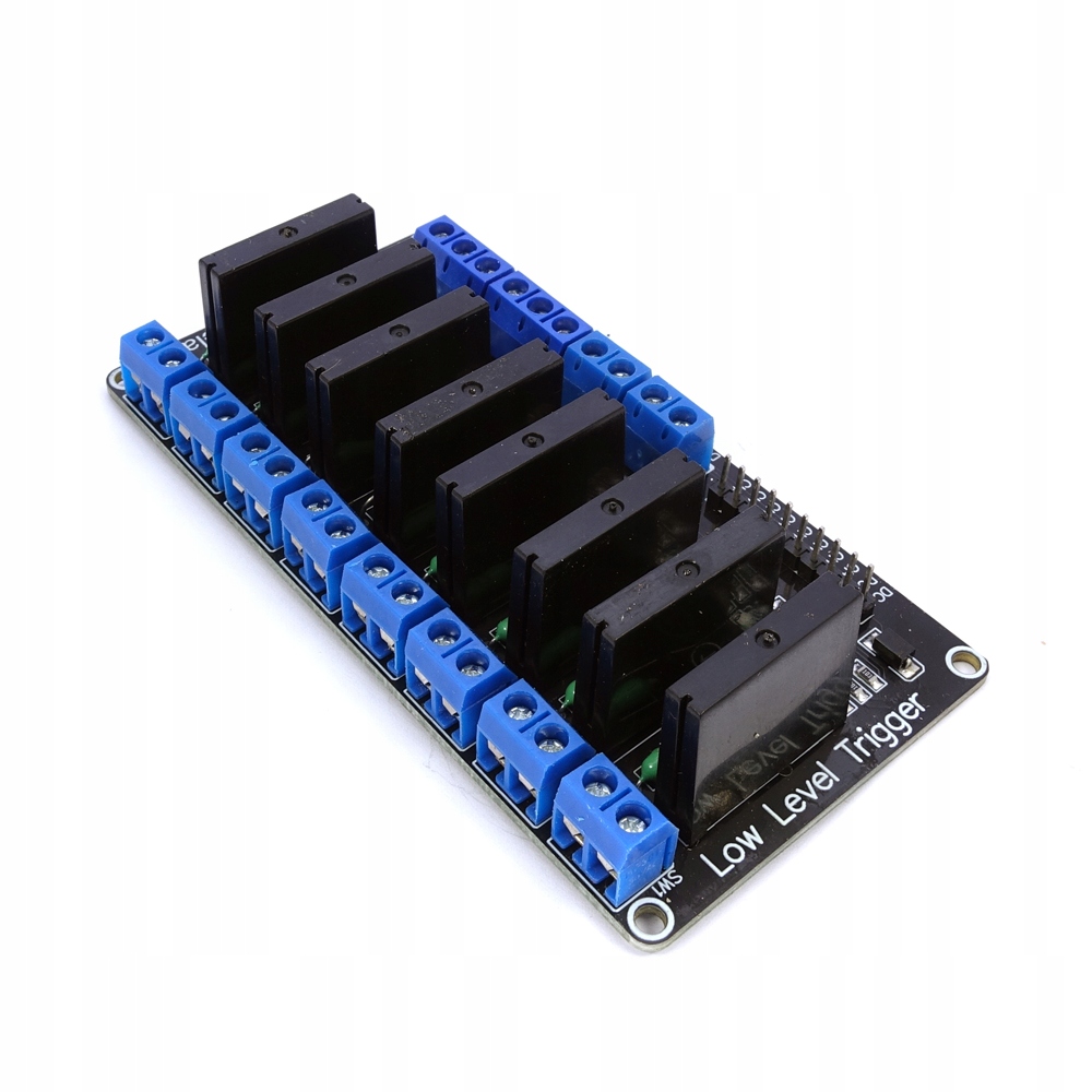 Модуль із 8 напівпровідникових реле, керованих низьким рівнем. Вони не мають механічних контактів, що забезпечує довший термін служби модуля та безшумне перемикання. Має світлодіоди, що сигналізують про активацію окремих каналів.