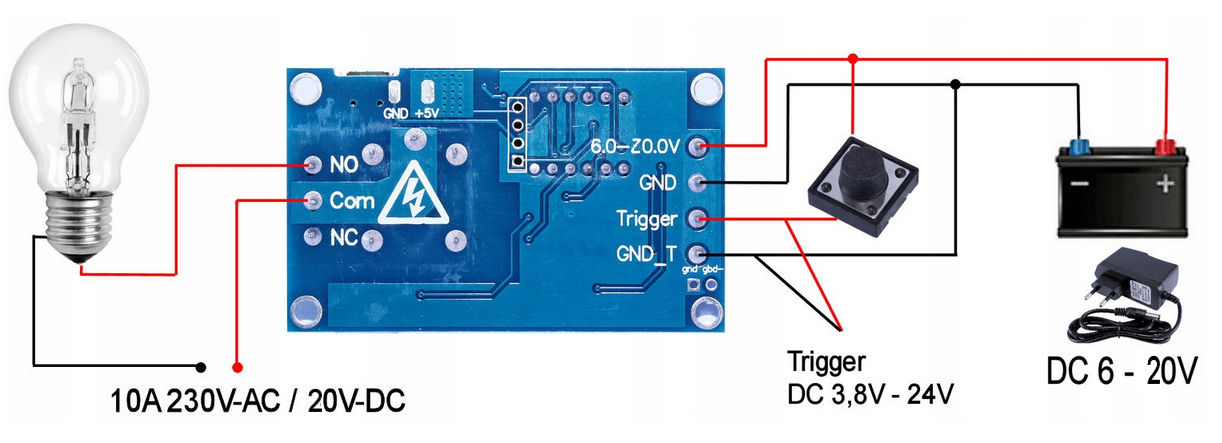 Функція 3.2 дозволяє модулю працювати без тригера, тобто коли ми живимо модуль таймера через роз’єм microUSB 5 В або через роз’єм 6,0–20,0 В, він починає зворотний відлік без необхідності запускати запуск і дозволяє нескінченна або задана кількість циклів роботи реле .