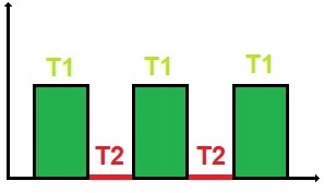 Після Після ввімкнення живлення реле вмикається і час роботи відраховується. Після закінчення відліку часу спрацьовування реле вимикається і відраховується наступний час (час перерви). Цикл повторюється нескінченно.
