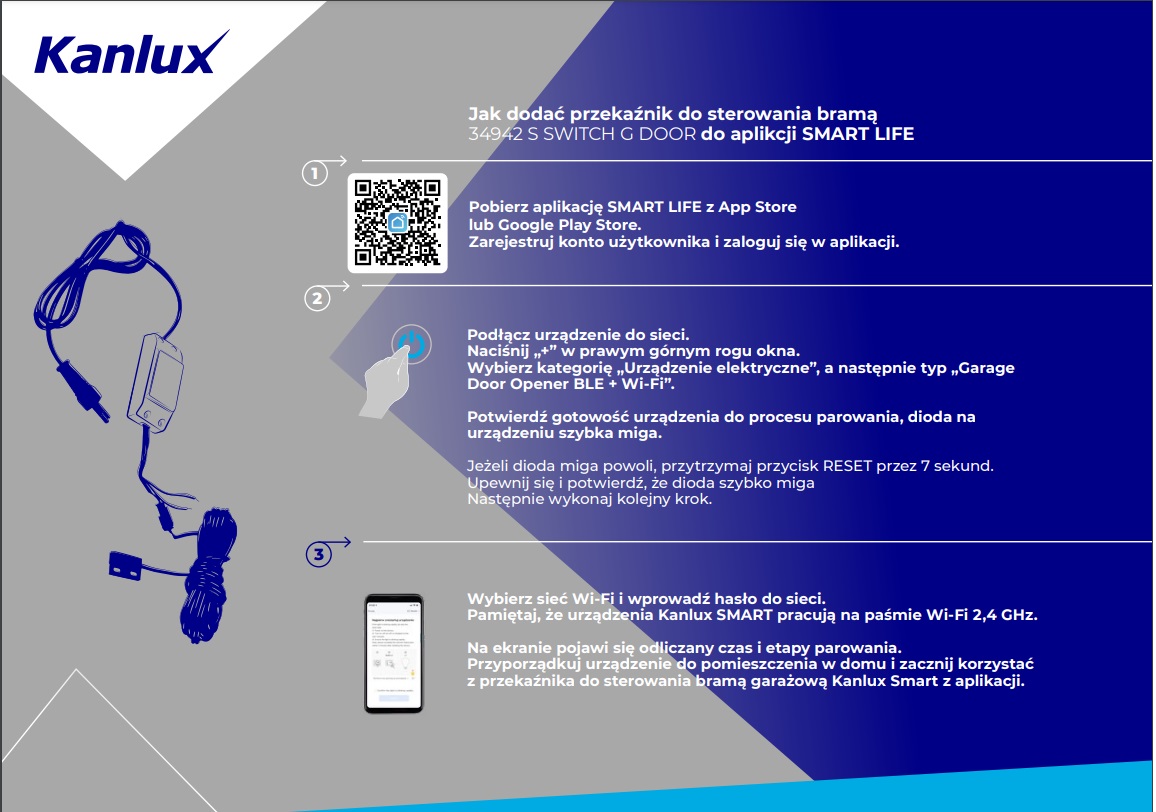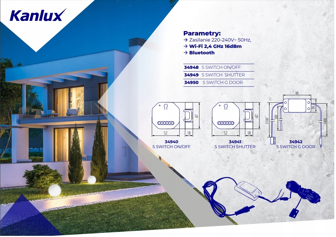 Реле для керування двигунами ролет і жалюзі, вбудоване (коробки діаметром 60 мм). Це дозволяє нам керувати рулонними шторами з програми, встановленої на мобільному пристрої. Дізнайтеся більше про Kanlux SMART на www.kanluxsmart.com.