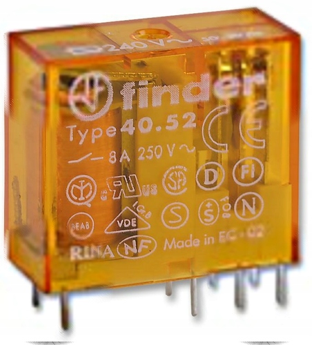 Електромагнітне реле, крок 5 мм, два перекидні контакти 2P, навантаження 8 A, котушка змінного струму 230 В 50/60 Гц, довжина штиря 5,3 мм для розеток, матеріал контактів AgNi