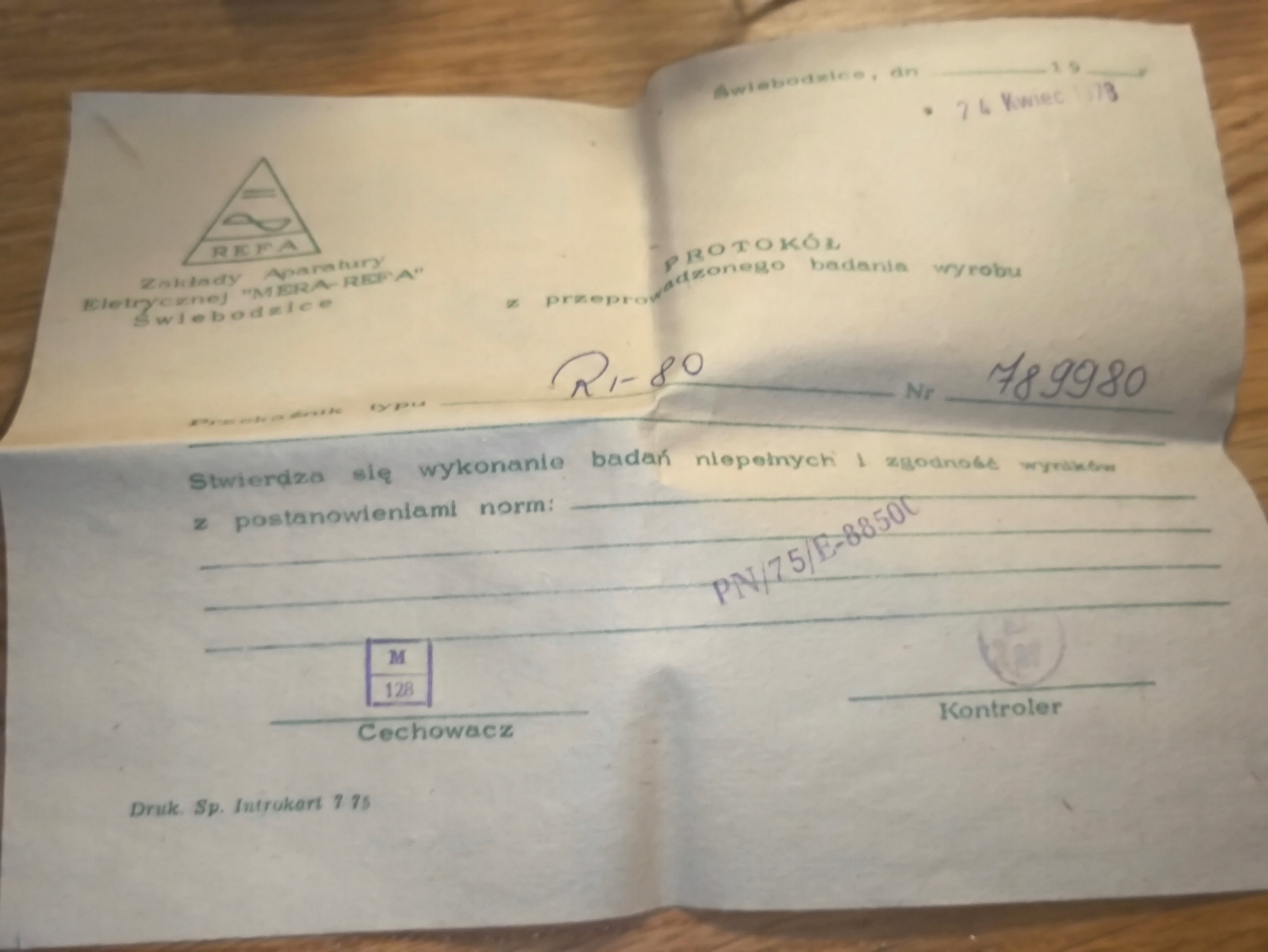 Реле супроводжується оригінальним звітом про випробування, виданим Zakłady Aparatury Elektrycznej MERA-REFA від 24 квітня 1978 року. Документ підтверджує, що були проведені часткові випробування та що продукт відповідає стандарту PN/75/E-88500. Номер протоколу: 789980.